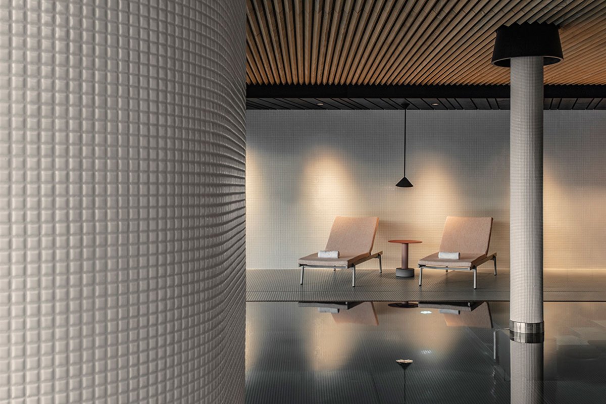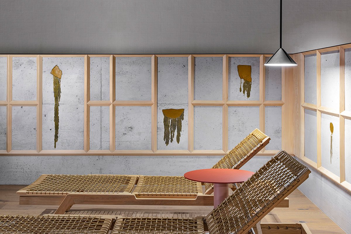 At the lower level, the swimming pool area makes the most of the change in grade and is entirely reconfigured to accommodate a new pool in direct connection with the outdoor spaces. The numerous existing structural supports found at this level are regimented into a robust procession of tiled columns that transform a formerly compromised space into one of tranquillity. Between the existing sauna and the new pool, a portion of the relaxation zone is redesigned to afford a higher level of privacy with a cast in place concrete wall clad in the recognizable frames of wooden profiles that feature insertions of “crying”, melted wax—an artistic installation by Hubert Kostner in an interpretation of the mythological story of Icarus.