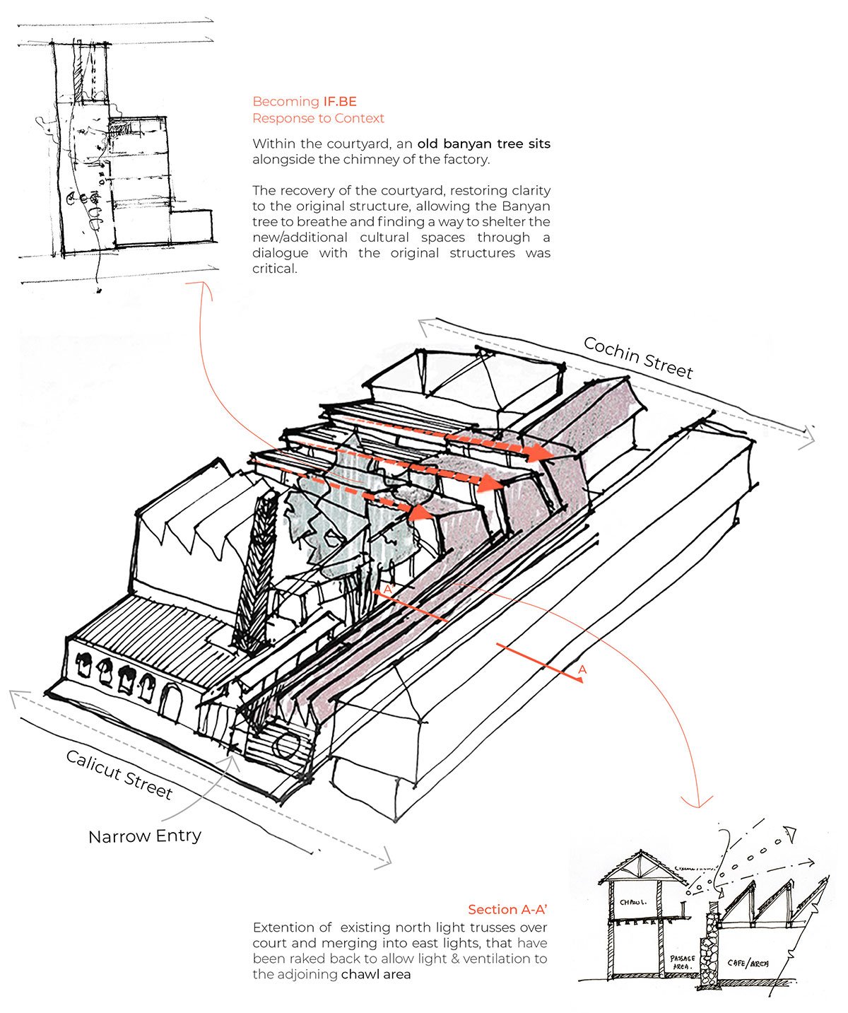 [Text as submitted by architect] The 140-year-old Ambico Ice Factory is located in Ballard estate, the heart of Mumbai’s heritage precinct. The architects have re-imagined the space as IF.BE (Ice Factory Ballard Estate), an organism that merges art/ exhibition/ events/ performance/ gathering/ food and design. Essentially it is a space for encounter, organised within beautiful but ageing structures surrounding a large Banyan tree.
