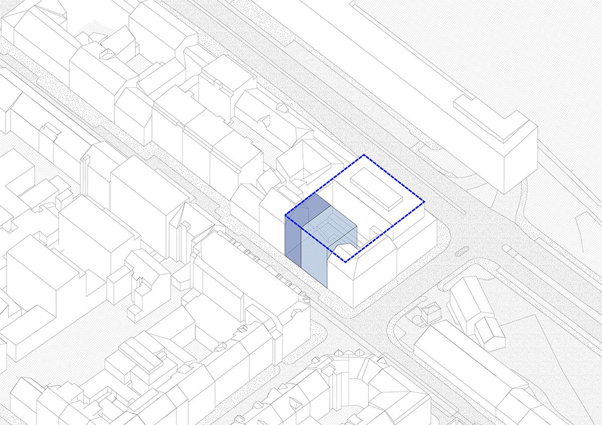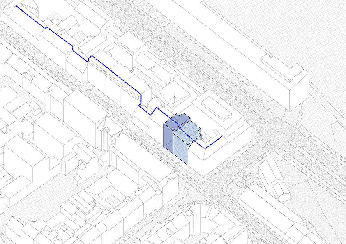 The protruding system of aluminium lamellas in the left part of the façade suggests the contours of the historic building that once stood on the site, thus recalling the original scale and spirit of the place. The ceramic cladding transitions seamlessly from the vertical façade to the roof level, while maintaining the building’s contemporary expression.