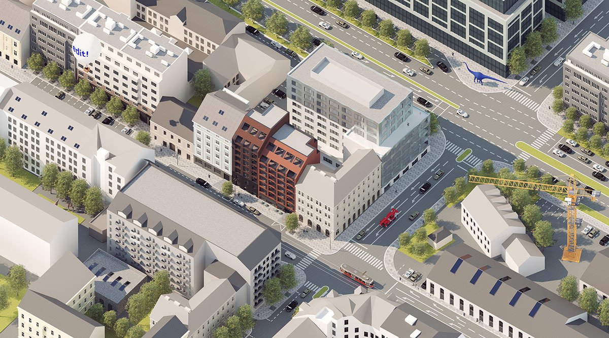 Planning solution: The internal layout is a classic three-tract with one vertical core, i.e. a standard solution of today’s Prague apartment buildings. The three basement floors accommodate parking, technical facilities of the entire building and cellars. On the ground floor there are two commercial units prepared for the operation of a restaurant or bistro with the possibility of utilizing the inner courtyard and the entrance lobby with access to all 48 apartments with a configuration of 1 bedroom + kitchenette to 4 bedrooms + kitchenette, located on levels two to nine – the last two floors are designed as a two-storey penthouse with a roof terrace.