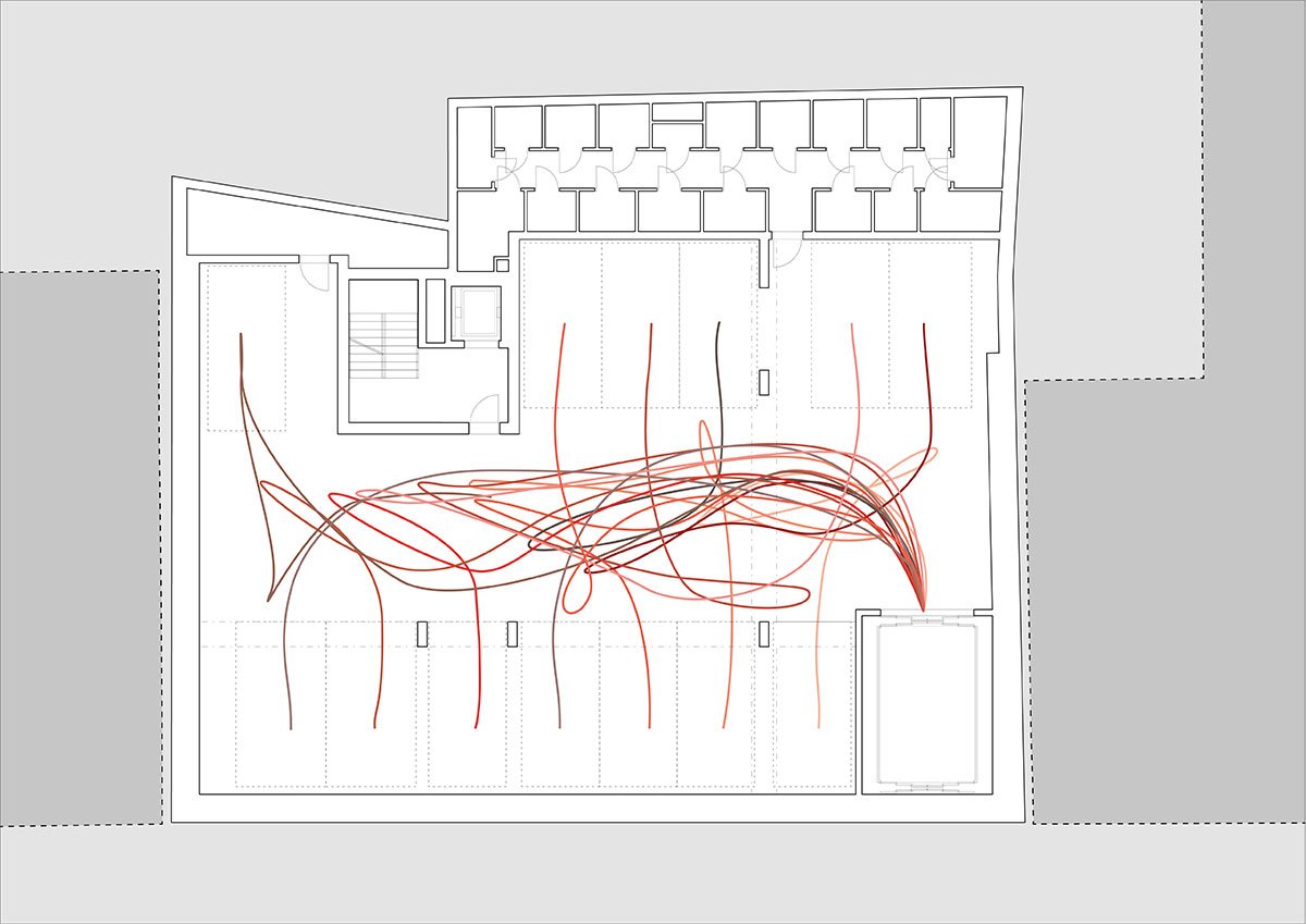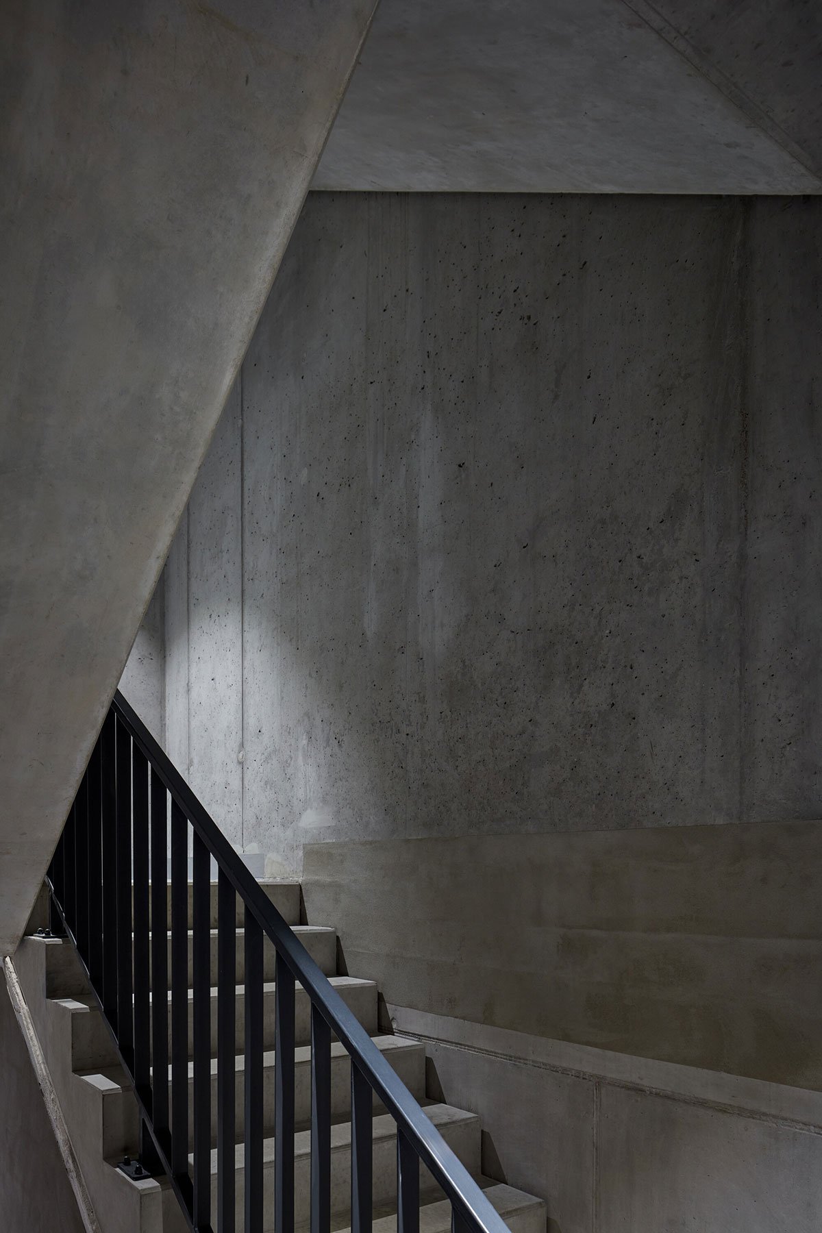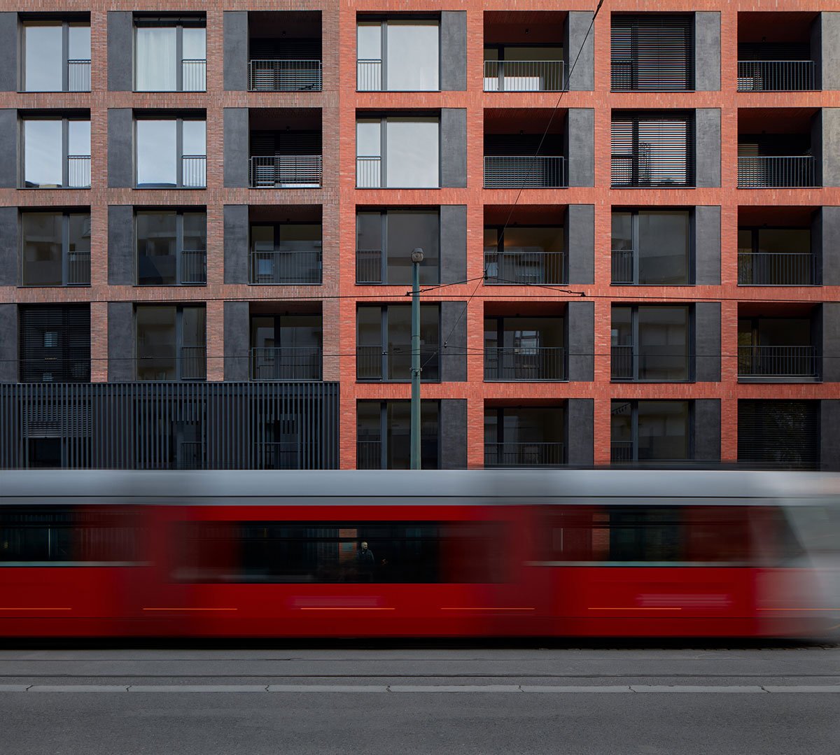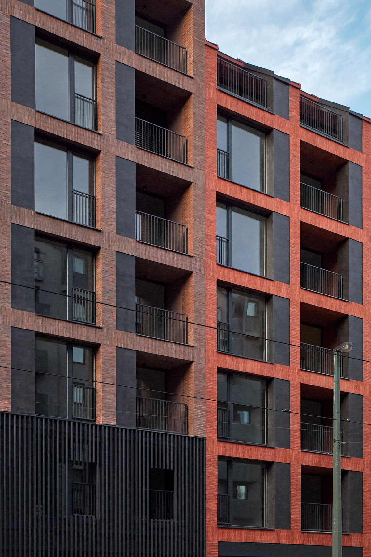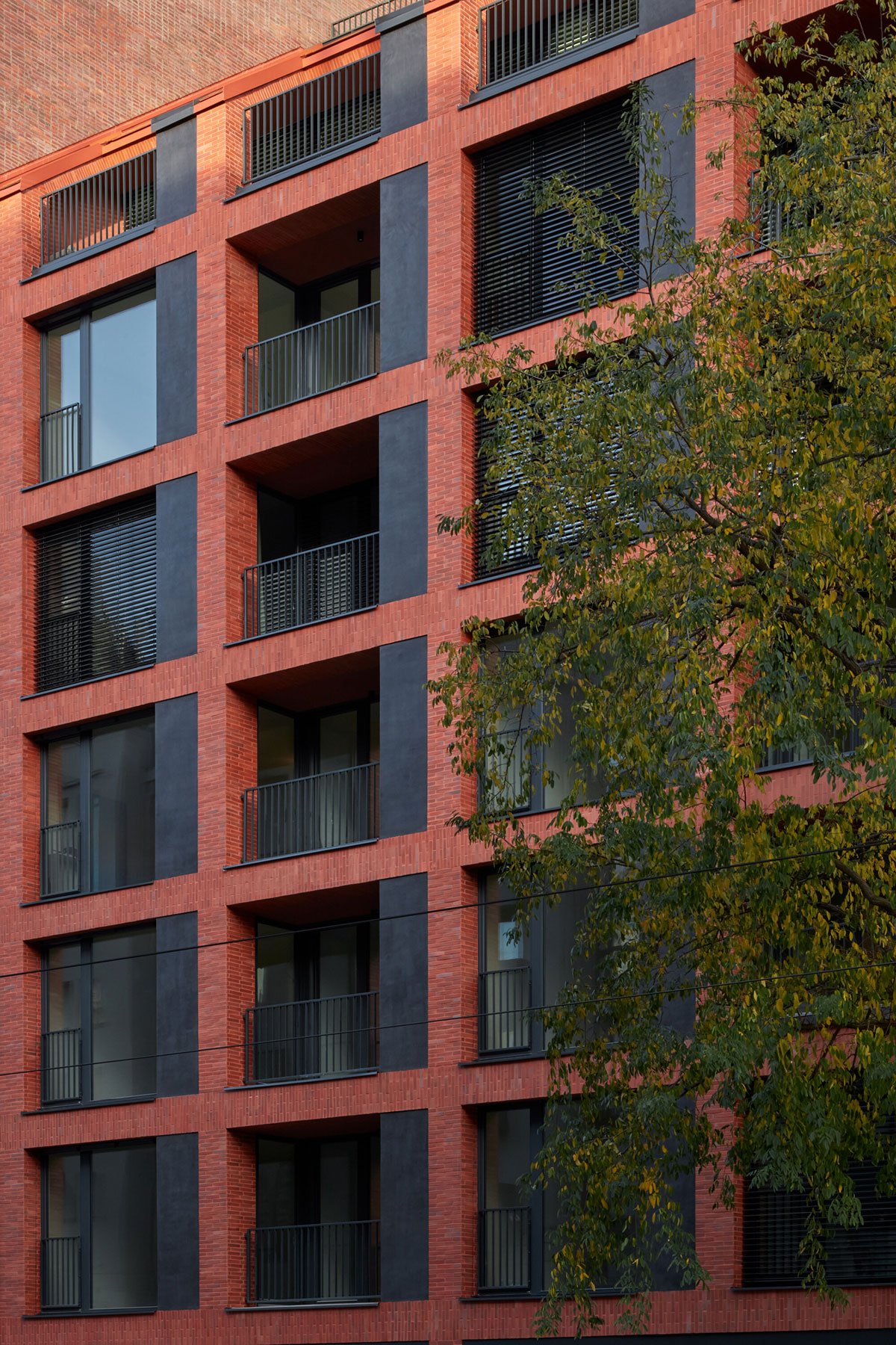 Facade: The building has two main facades. The first is oriented to the street and the second to the courtyard. The street façade establishes the identity of the building itself, where the ceramic cladding with two-tone decoration refers to the traditional materiality of the façades of the 1930s apartment buildings, but also to the local industrial buildings, which have now almost disappeared from the site due to massive development.