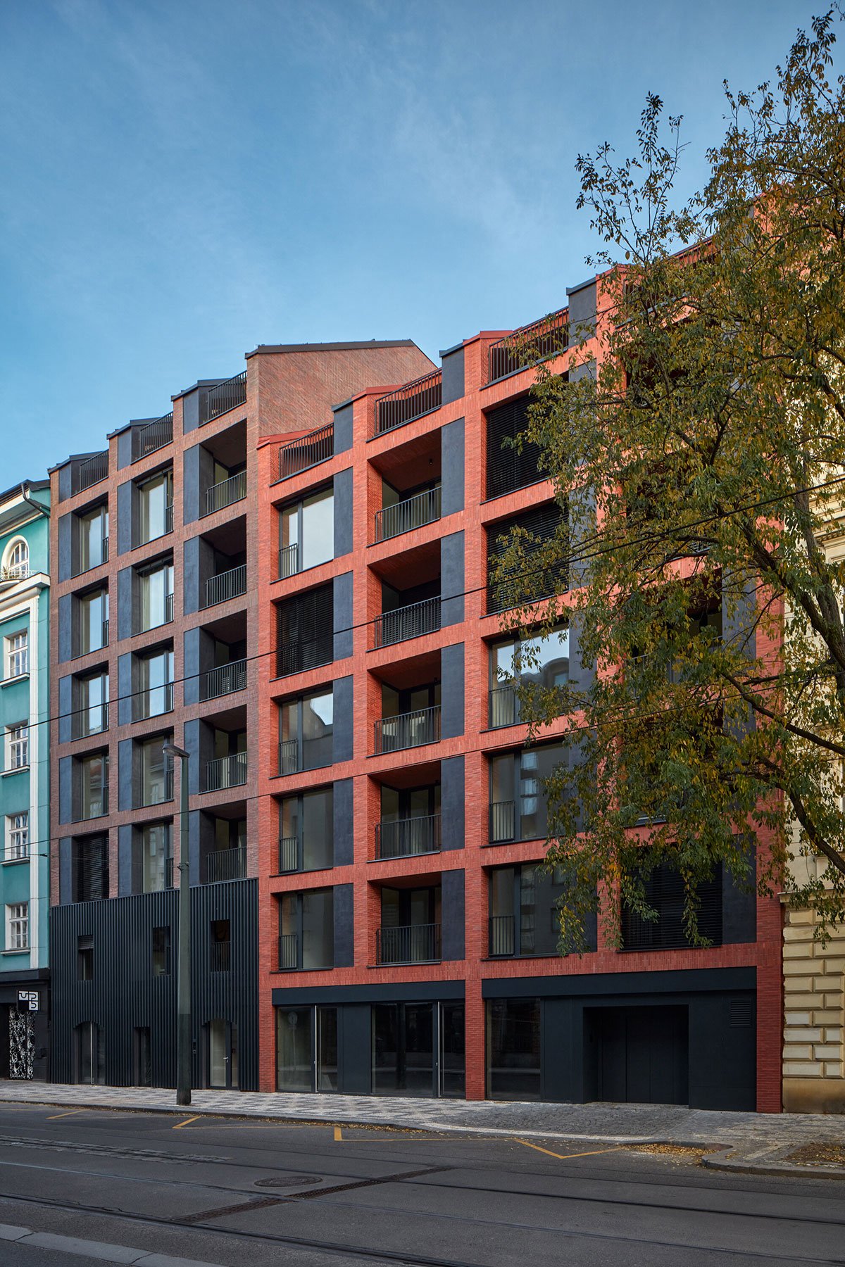 [Text as submitted by architect] Iconik, a nine-storey apartment building designed by the architectural studio Edit!, is located in the Karlín district in Prague at one of the last empty sites resulting from the millennium flood. The plot is situated on the main avenue of a district, which ranks among the most desirable Prague locations, and which has undergone a major architectural and social transformation in the last two decades – once an industrial district transformed into a hip centre full of start-ups offices, restaurants and nightlife with its former Secession buildings and factories being now home to top-level gastro and independent galleries. The proposed building reflects the rich history of the formerly industrial area in its expression, and its material concept is based on both the historical plotting of the built-up area and the irregular height arrangement of the crown cornices typical for Karlín.