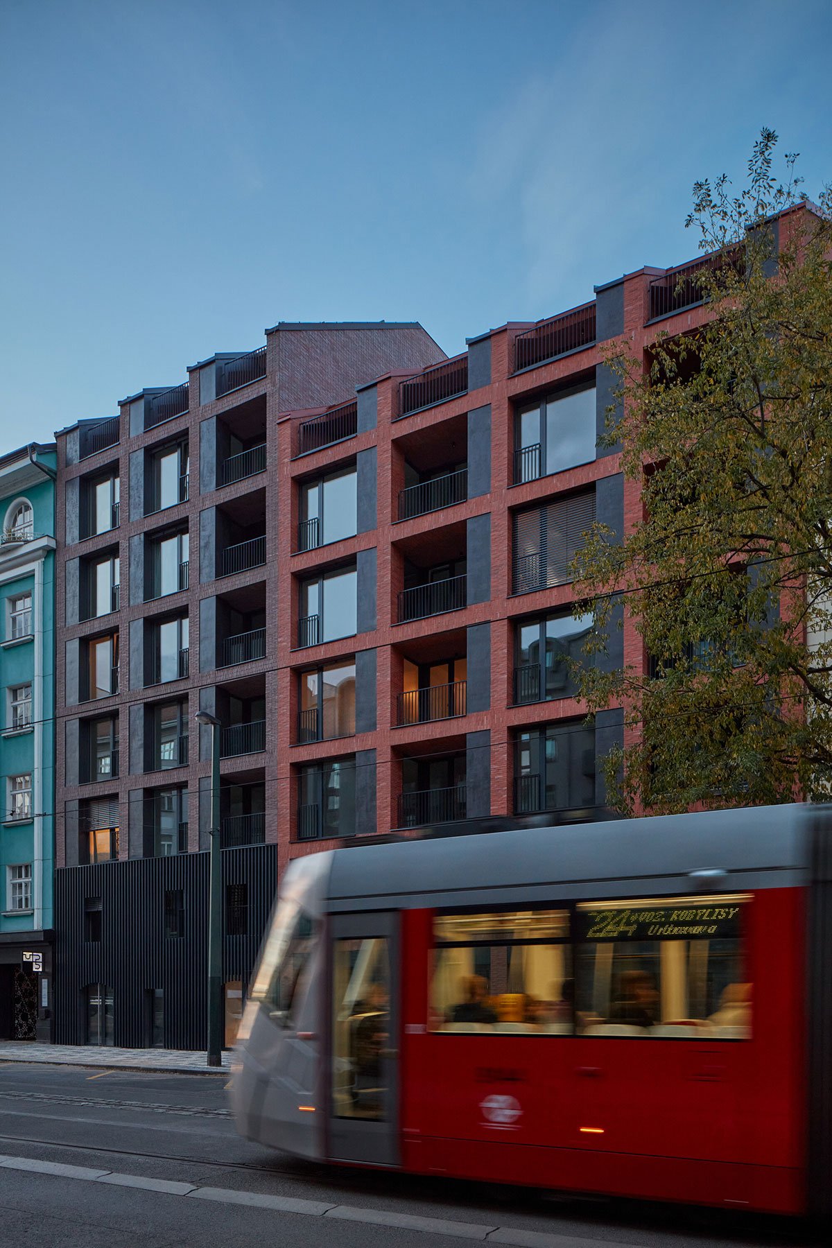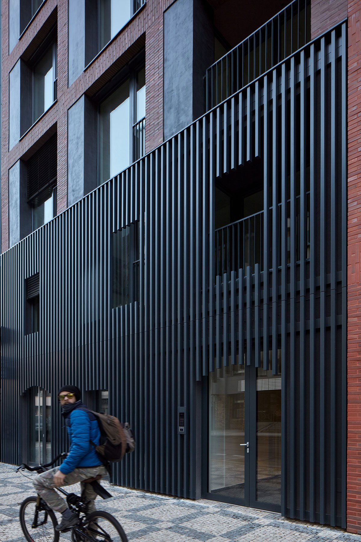Neighbourhood context: The aim was to design a residential building that makes efficient use of the available space in accordance with local regulations and the surrounding context. The brief called for the building to pay natural respect to the history of the neighbourhood, the transformation of which the initiators of the project, the Karlín Group and its founder Serge Borenstein, were co-creating since more than twenty years ago – it was them who in 2002 after the flood invited the Catalan architect Riccardo Bofill and young Czech architects and developed a proposal for the transformation of the entire Karlín area.