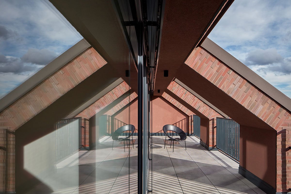 The volumes are further characterised by a grid of windows and loggias. The system of facade openings allows for proper light to reach each apartment – all windows are designed with a low sill at 450 mm above the floor, divided into fixed and openable parts, and each opening on the upper floors is provided with an external railing, the same principle is also applied to the windows in the adjacent sloped roof. If necessary, especially on the south façade, the windows can be supplemented with fabric shading.