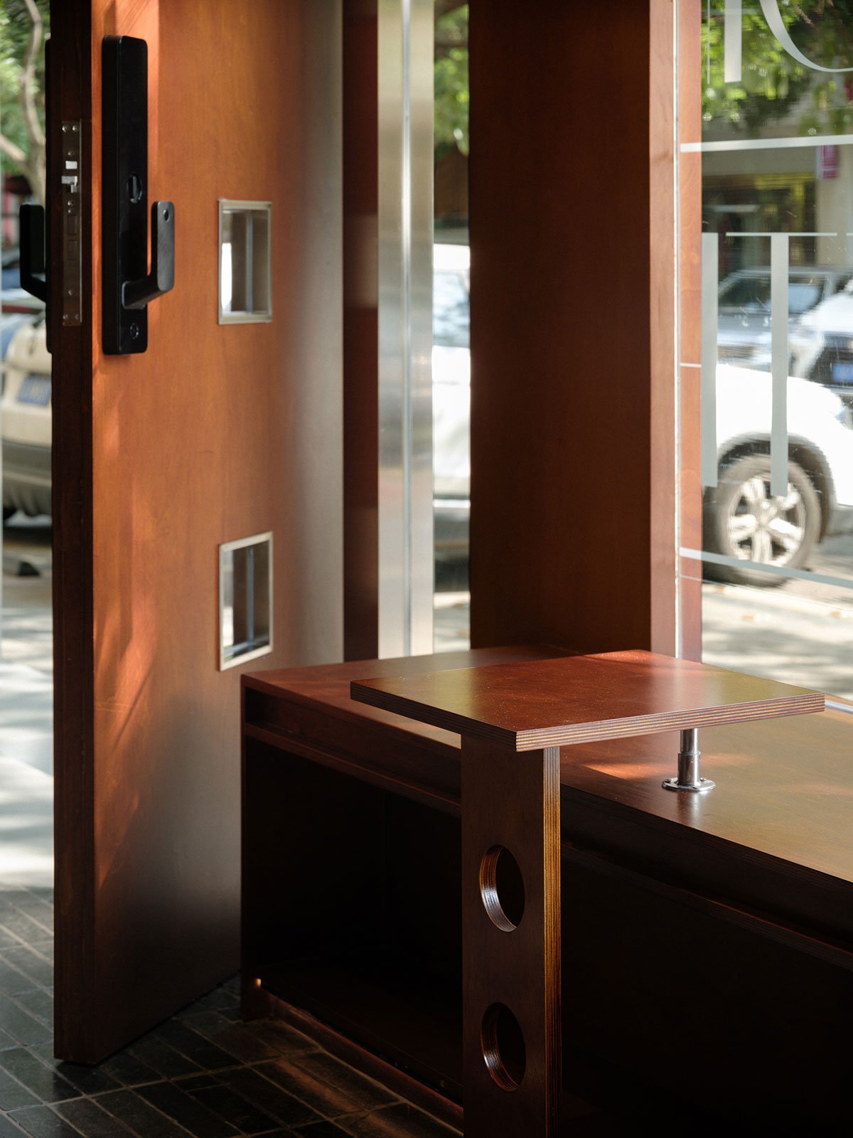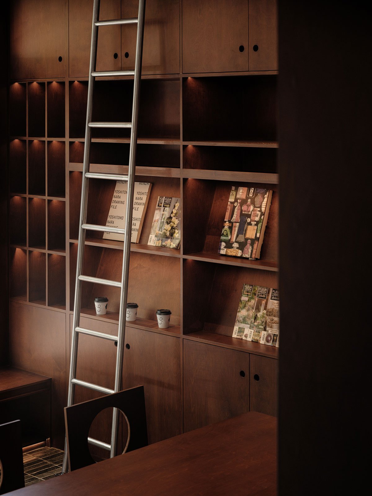 On one side of the space, there is a display cabinet made from the same type of wood. It’s a three-tiered wooden display case that can hold various items such as coffee cups, magazines, and audio equipment. The metal sliding mechanism makes it easy and convenient for both customers and baristas to retrieve items.
