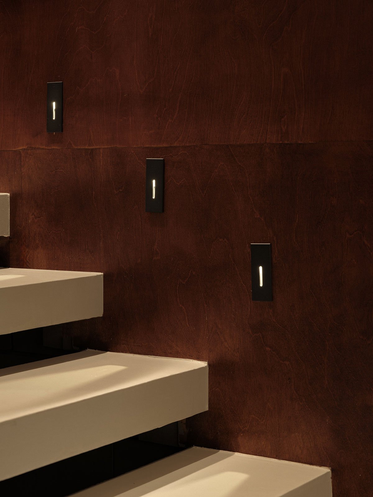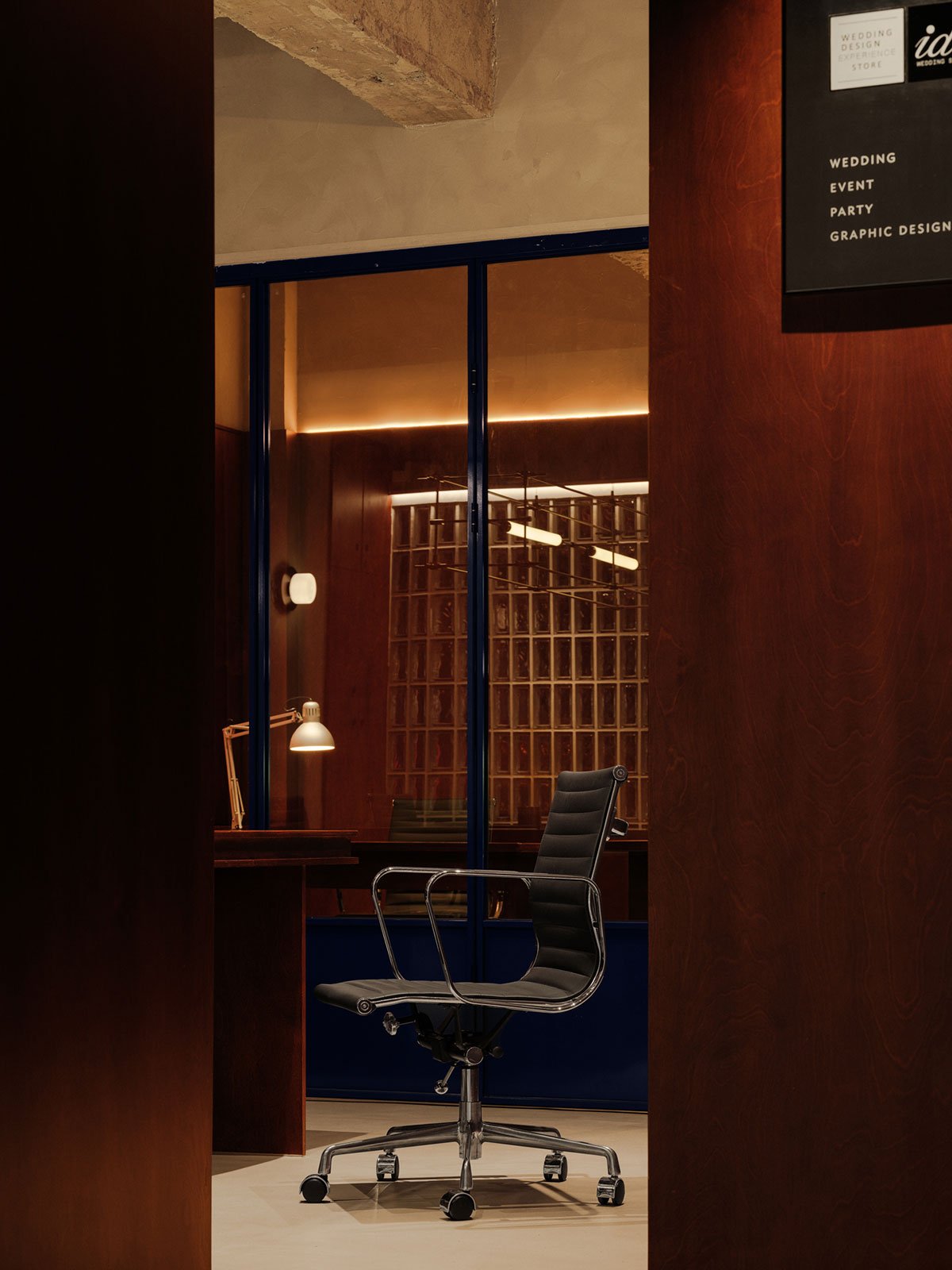 The combination of stone steps and the glass brick wall delineates a relatively private office space while remaining open to visiting guests. The minimalist linear desk lamp provides uniform lighting that is both calm and warm. The horizontal and vertical pipelines, along with bookshelves and glass bricks, create a visual harmony in the space.