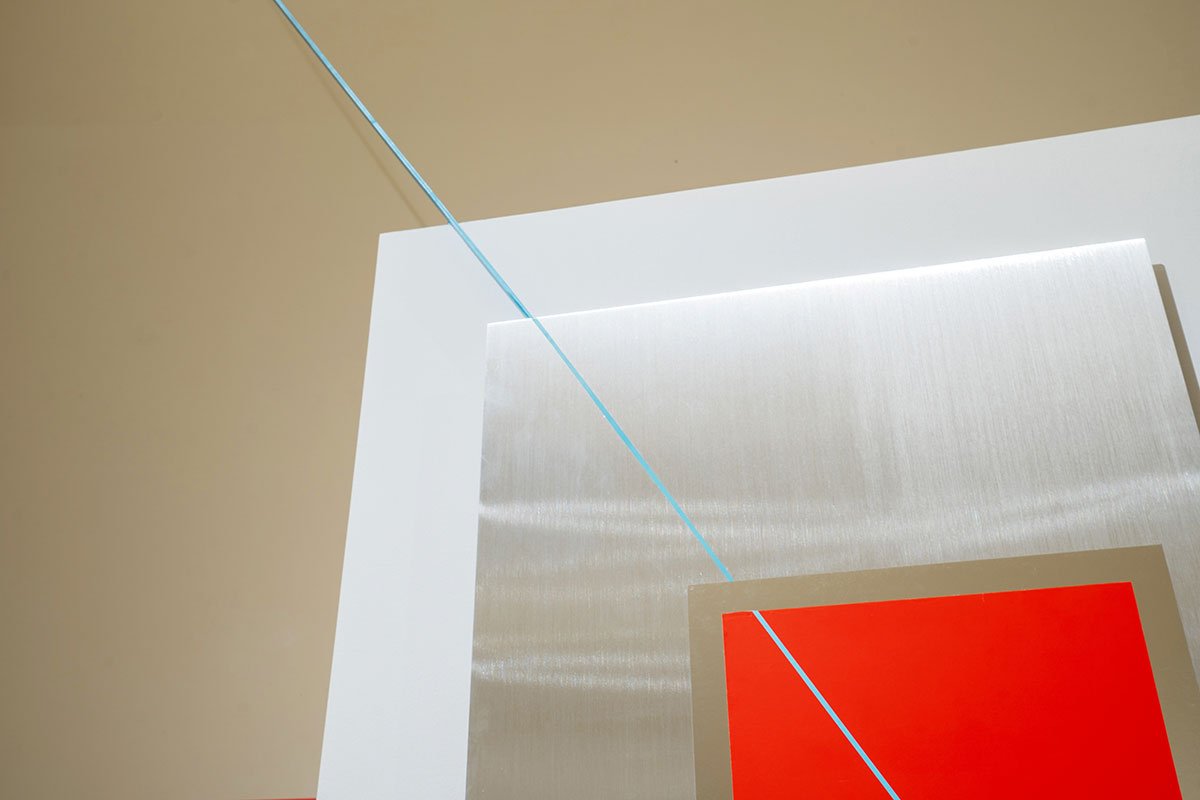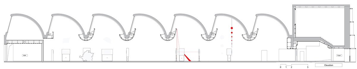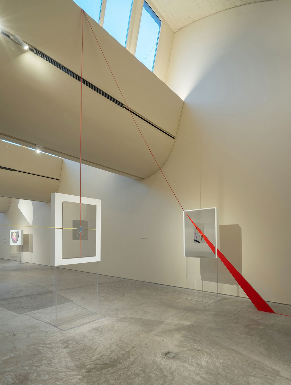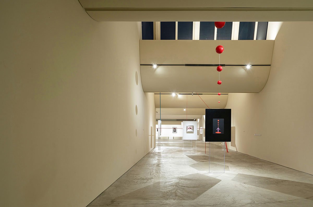 Stand in the long and narrow exhibition area, red balls hover vertically in mid-air, and the colorful carbon fiber lines connect heaven and earth. They guide the eyes to look up and shift, inspire people to explore and think in multiple dimensions and form a potential, blurred boundary to separate the different exhibition sections.
