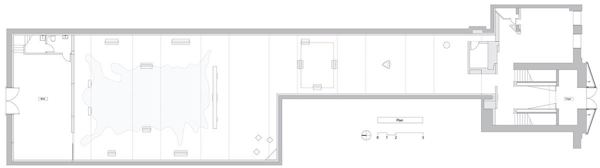 The rectangular main exhibition area emphasizes a sense of unsteady flow and energy. The white liquid figure gushed out of the painting and covered the concrete floor with the material floor glue, breaking the rule and frame of the front half and spreading freely. A large area of white space in the center is the best place for meditation to return to the empty and self-inspect.