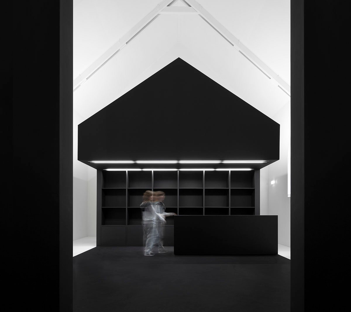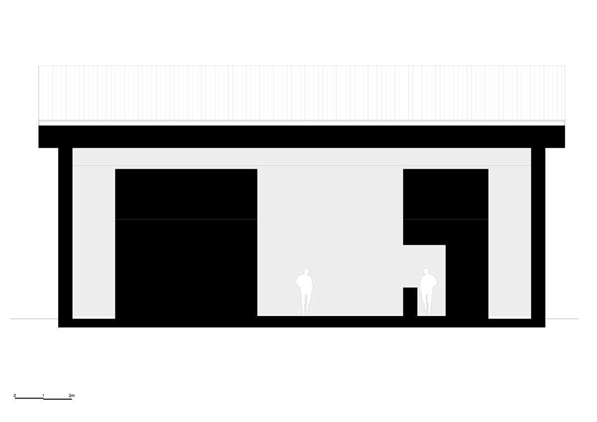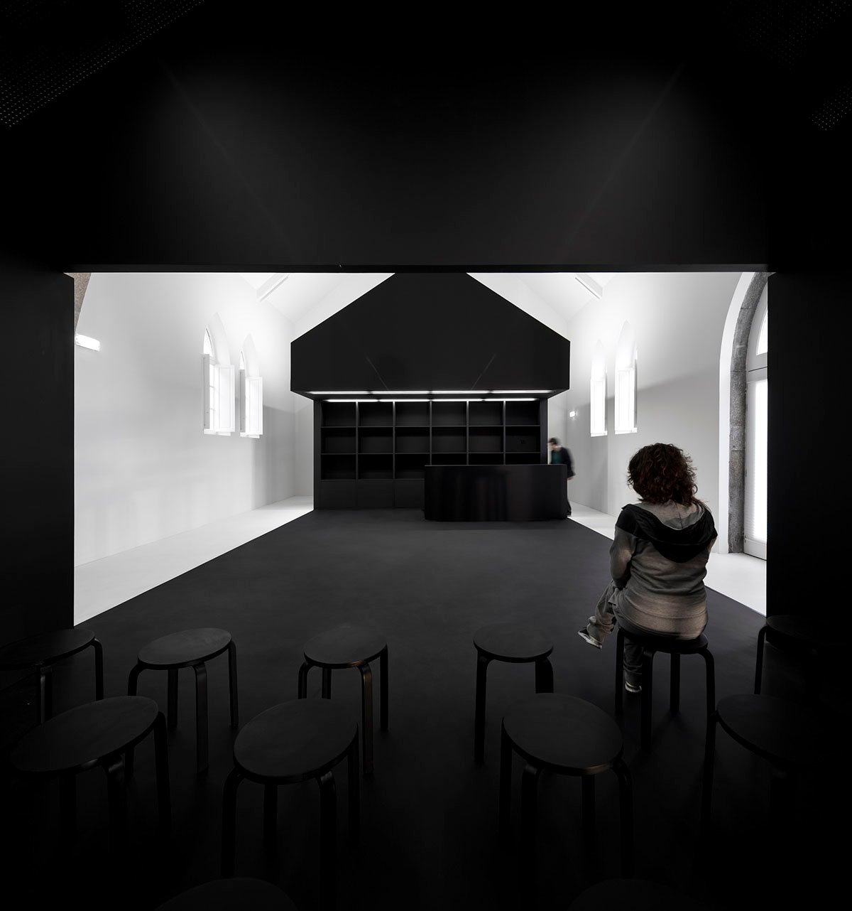 To this volume is subtracted the central area resulting in a kind of square, a point of reunion, separating the different functions of the space. The largest of the two volumes houses an informal auditorium, while the second contains an information desk with a storeroom and toilet tucked behind.