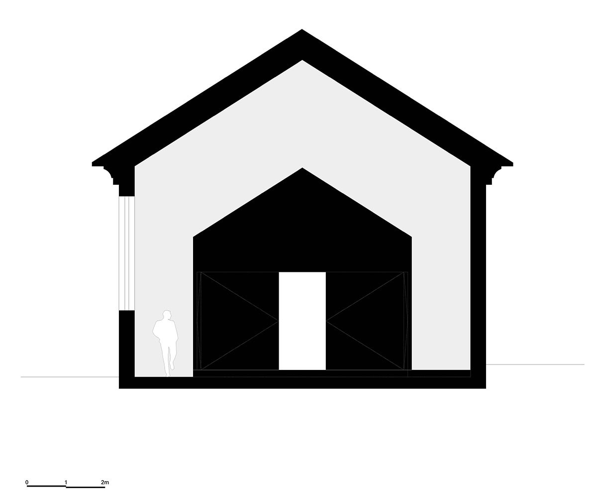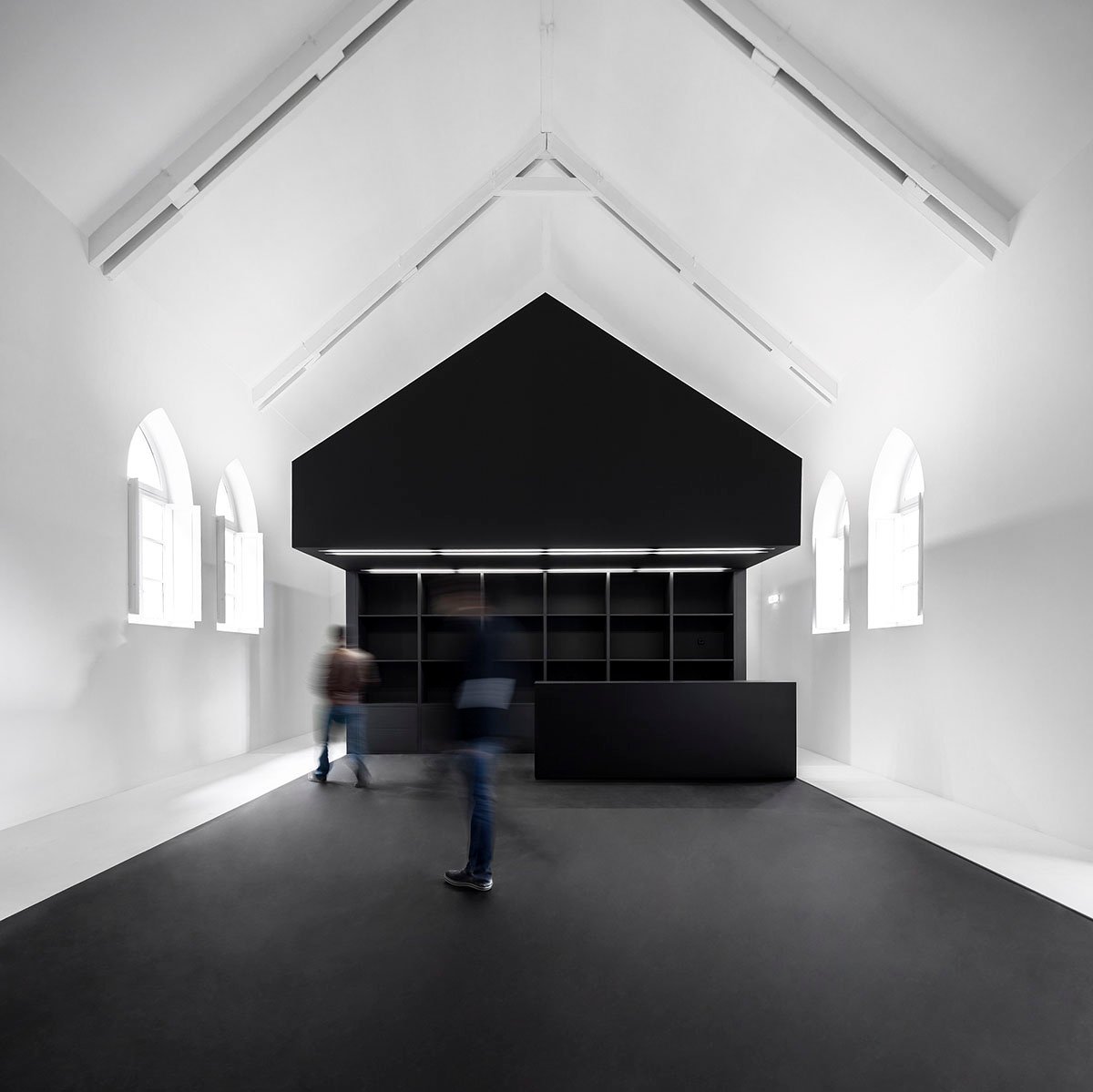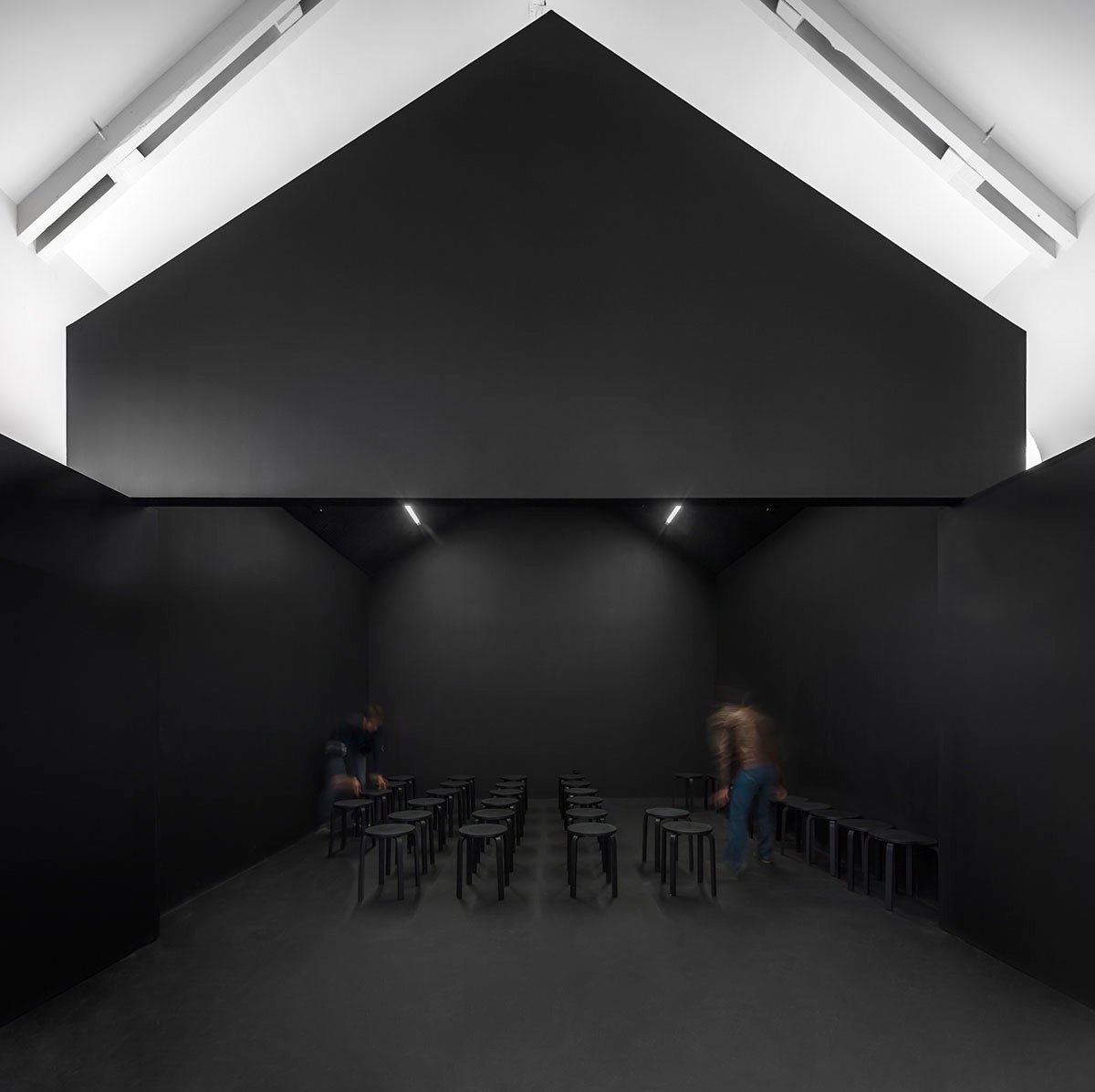 To this volume is subtracted the central area resulting in a kind of square, a point of reunion, separating the different functions of the space. The largest of the two volumes houses an informal auditorium, while the second contains an information desk with a storeroom and toilet tucked behind.