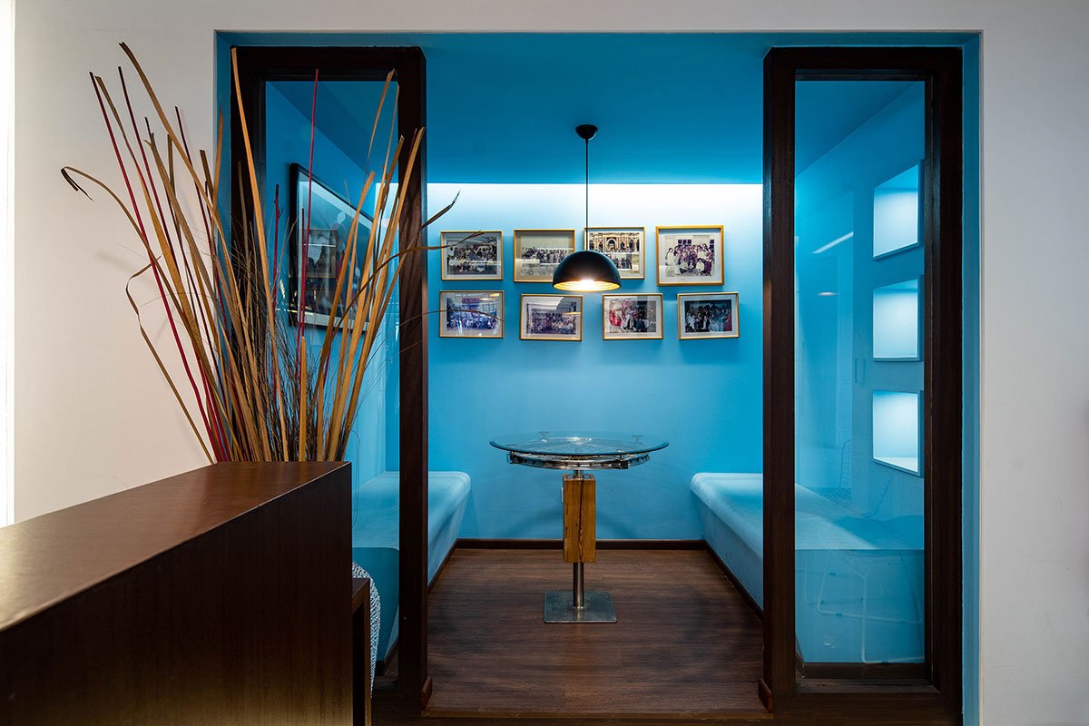 The radiant blue and complementary warm orange adorns the walls and frameworks in resonance with their brand colour. In addition, the ceiling is simple and unconcealed, showcasing the ducts embellished with the input of the colours and thus generating a raw and rustic aspect of the interior. This method not only enhanced the environmental quality of the office but also helped to deplete the expense. Working under a budget is always been a constraint to the thinking process, but it benefits in making design decisions and bringing out the outlook that explored simple ideas into a meaningful perspective.