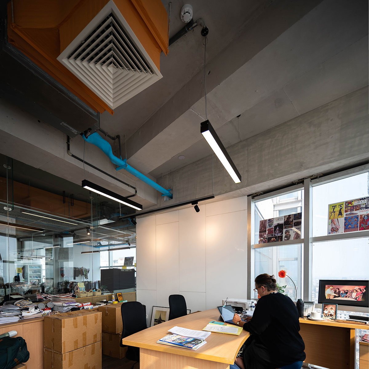 The open office space ensures that each zone is visually connected with the others, simultaneously maintaining individuals’ privacy. Moreover, the floor has different functions assigned in each zone, from a cosy informal corner to a formal working space, allowing experimentation with different lighting to create distinct, desired ambiences as per the requirements of a particular area.