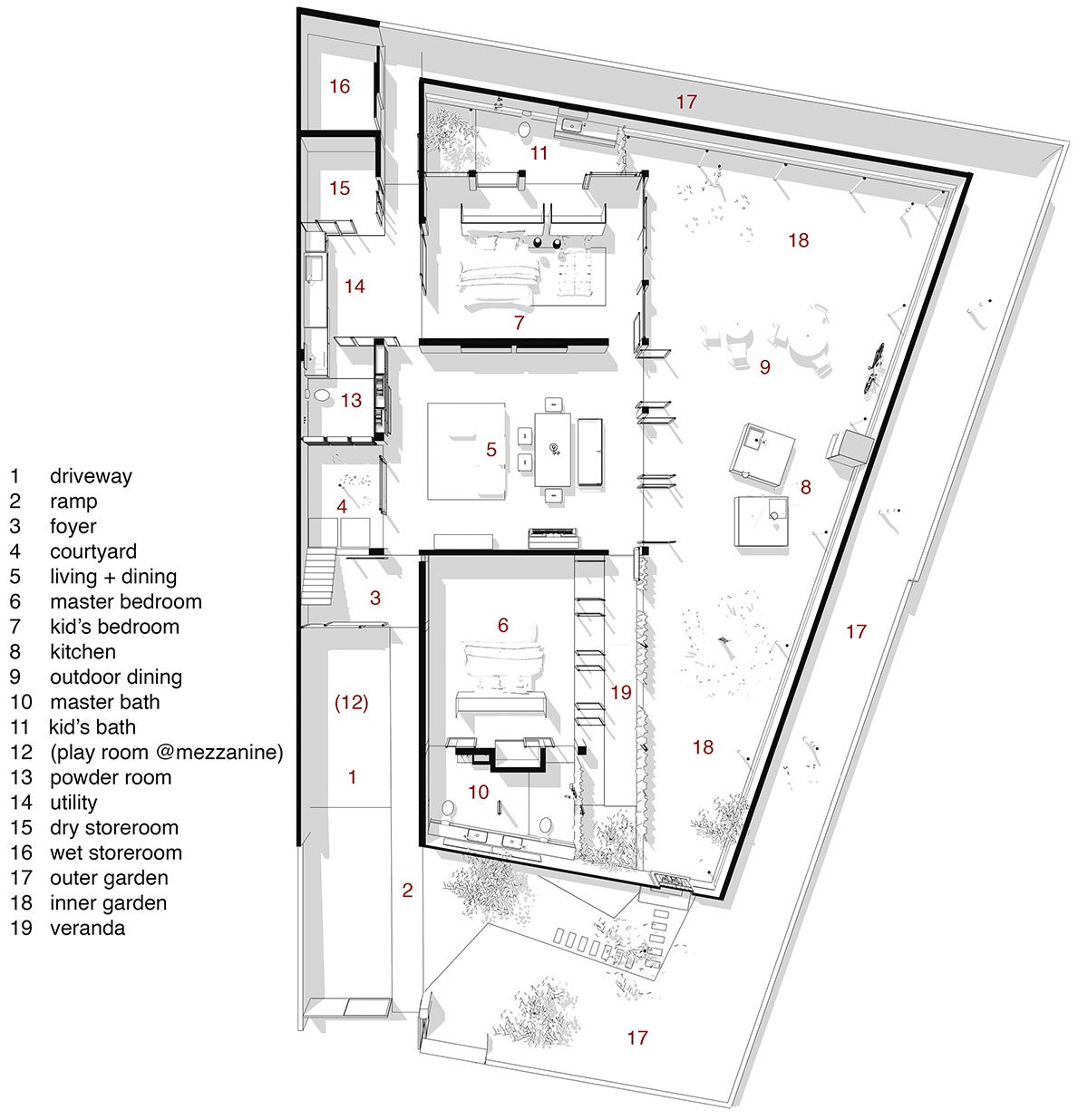 These inward-facing spaces surround the core of the house—the living and dining room—defining the essence of home. Two bedrooms flank this central area, completing the primary structure of the house.