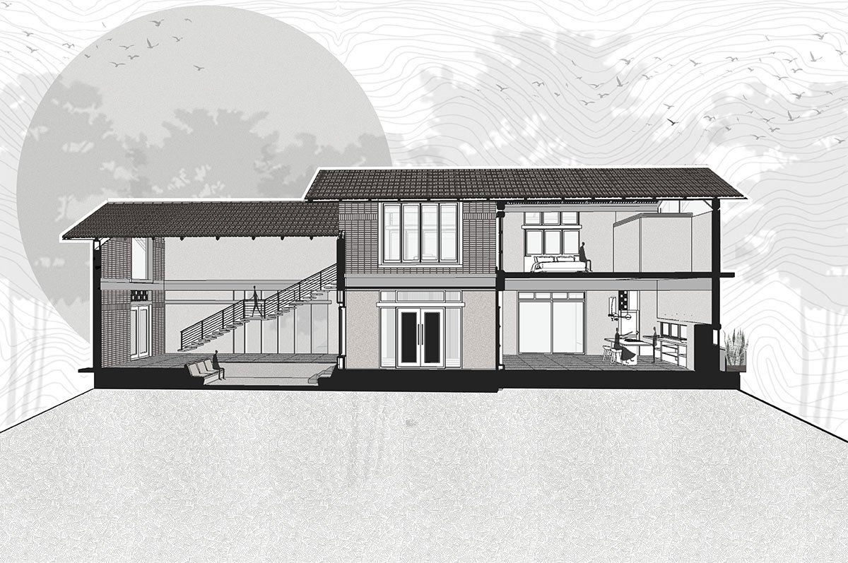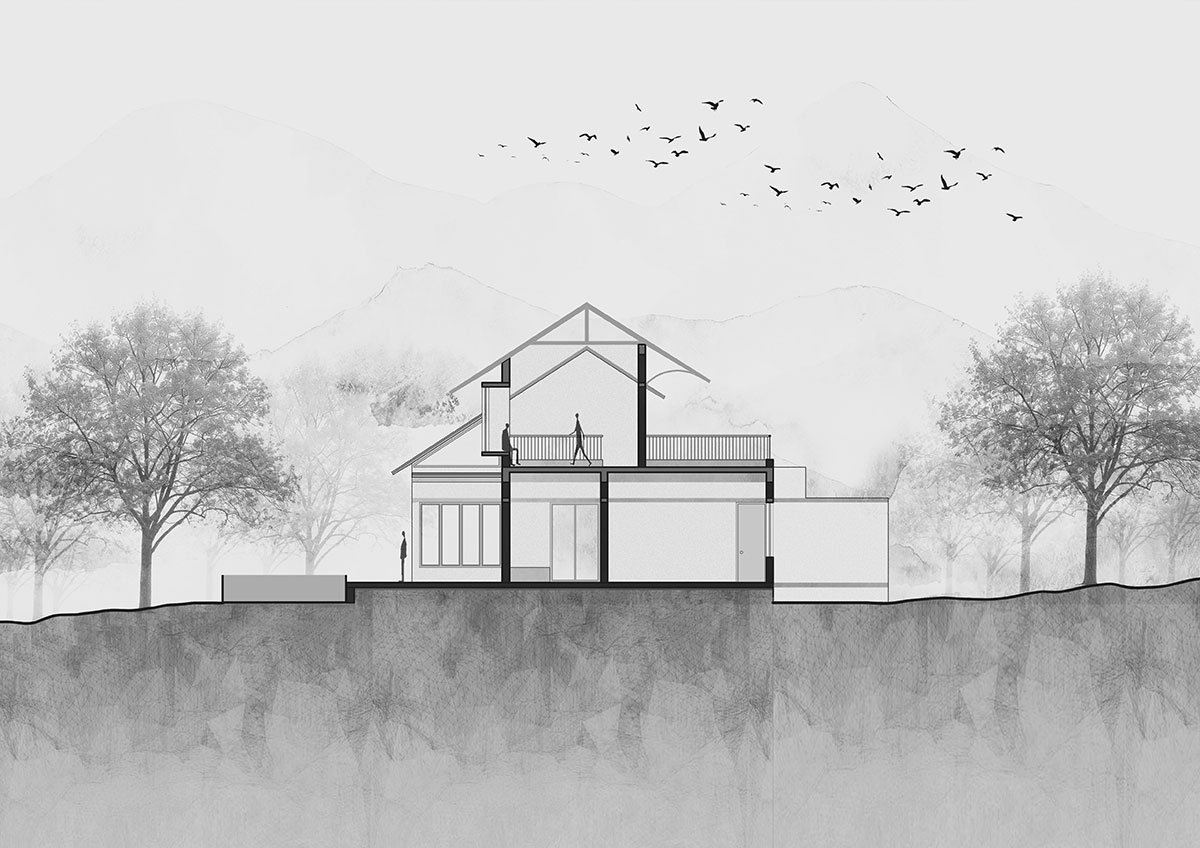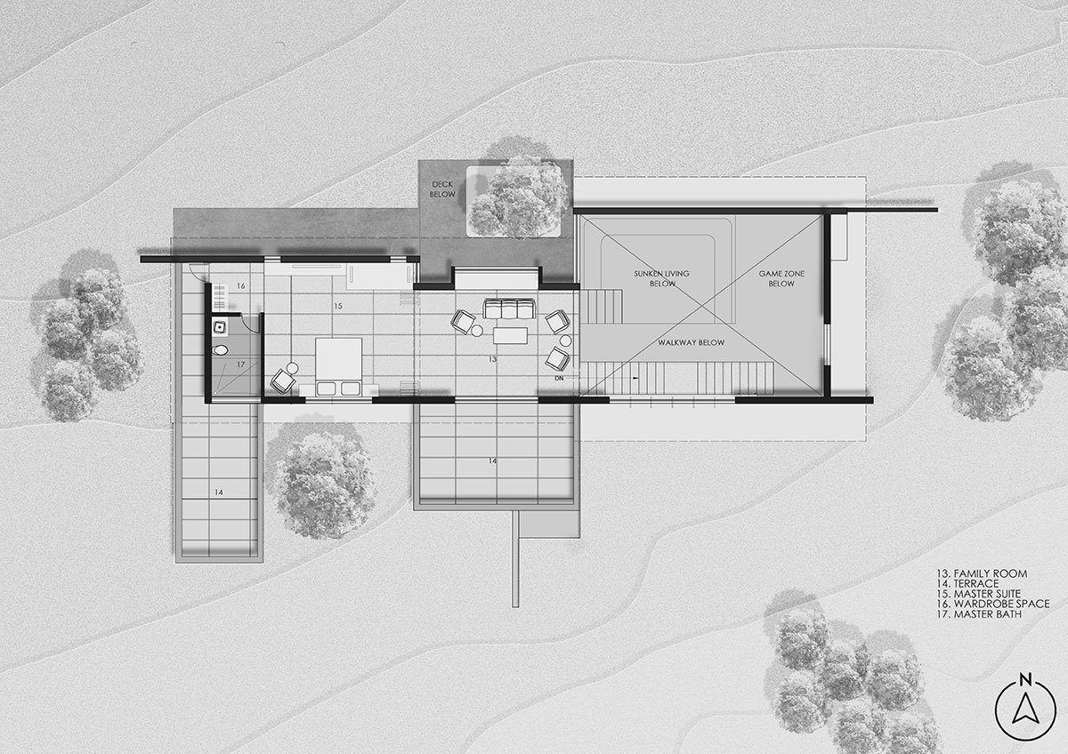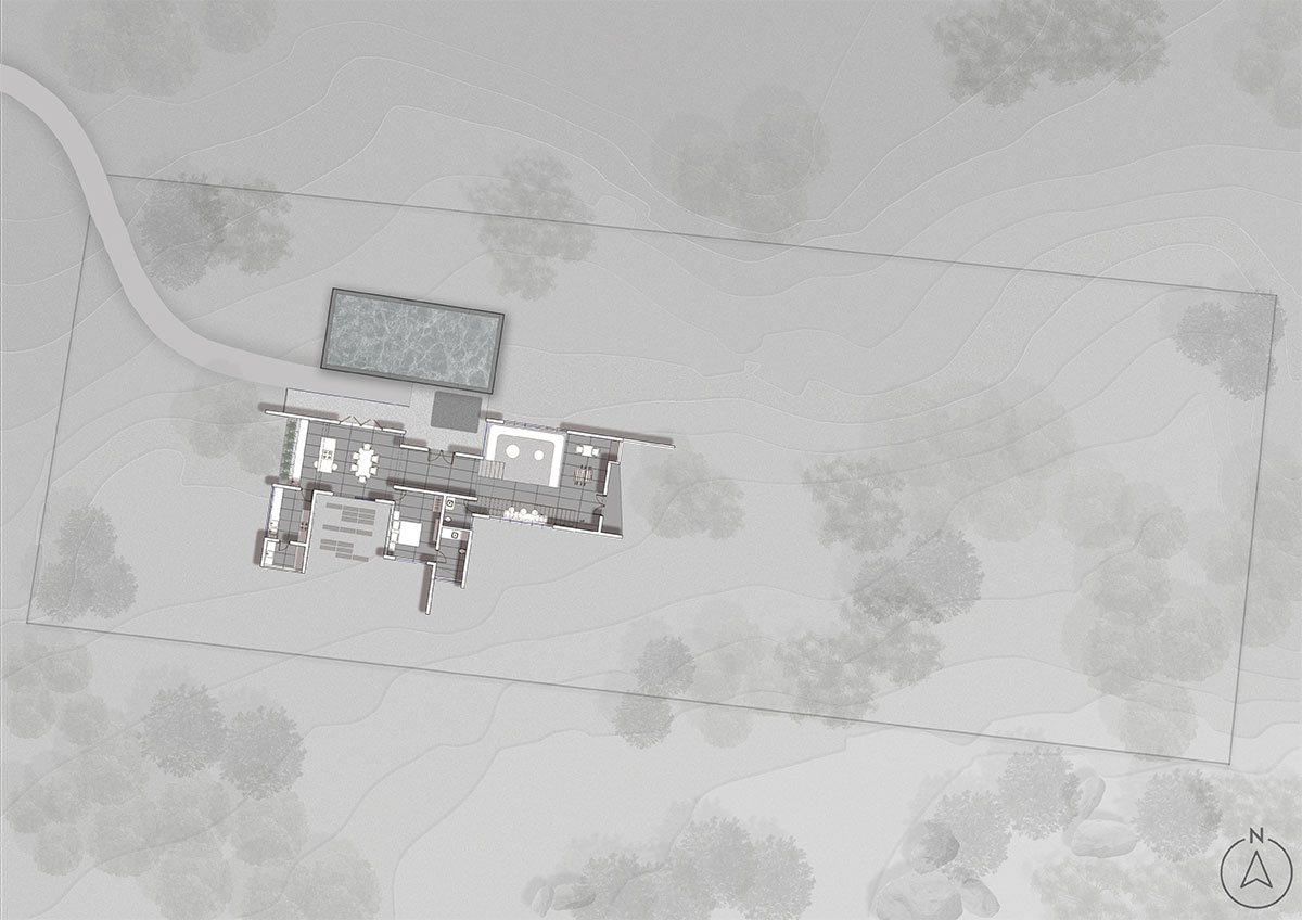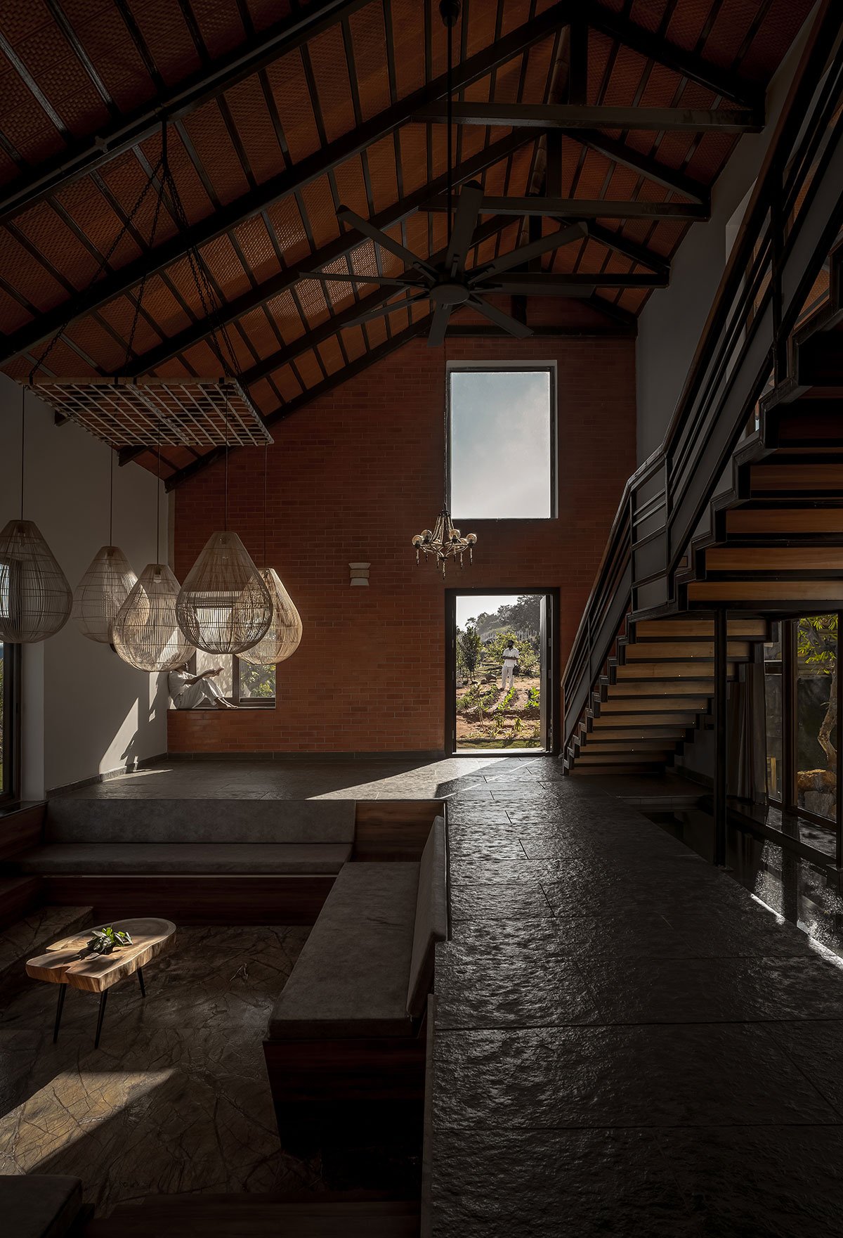The ground floor accommodates the primary gathering spaces along with a guest suite, while the upper level features a family lounge overlooking the sunken living area, as well as a master suite designed for both solitude and flexibility. Thoughtfully placed openings frame curated views of the surrounding hills, ensuring an uninterrupted connection with nature. The design encourages effortless transitions between indoors and outdoors, allowing residents to experience the changing moods of the landscape—from misty mornings to golden-hued evenings.