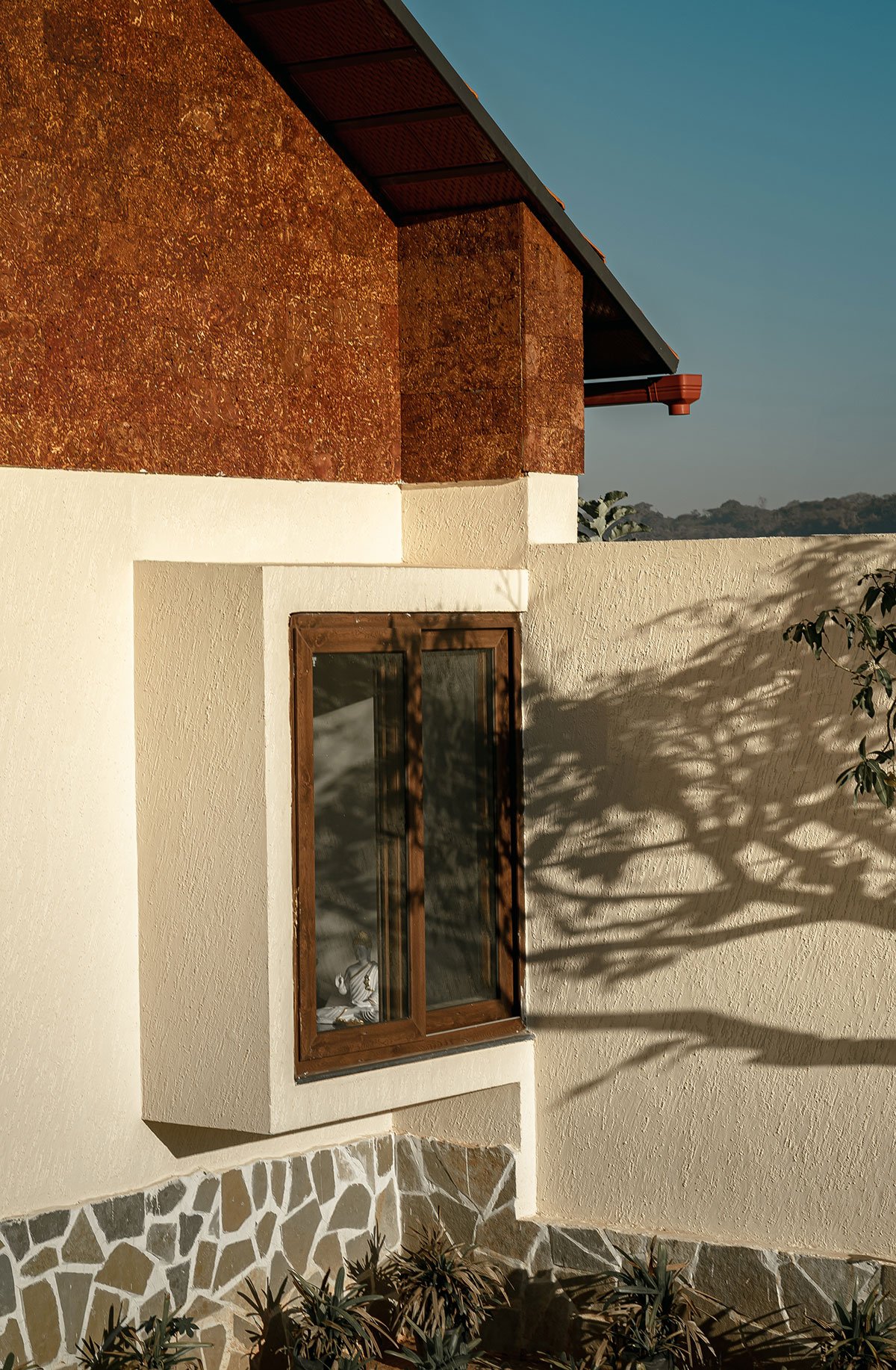 Sustainability is at the heart of Ishavas. Locally quarried laterite stone forms its walls, Kota stone grounds its floors, and mud-plastered surfaces finished with lime wash lend a natural warmth. Passive design strategies—cross-ventilation, shaded courtyards, and climate-conscious orientation—enhance thermal comfort while reducing energy demands. A 5KW solar system powers the home, while rainwater harvesting points are strategically positioned across the site, ensuring efficient resource management.