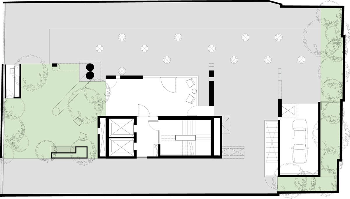 By accommodating the parking within the basement, the street level, up to a height of 11.0m is devoid of residential spaces. Instead, structure and volume are set back from the street and organized within a garden shaded by the cantilevered residential volumes above. At the street level the language of water, trees and low rise, set back spaces create the first point of mediation with the urban condition.