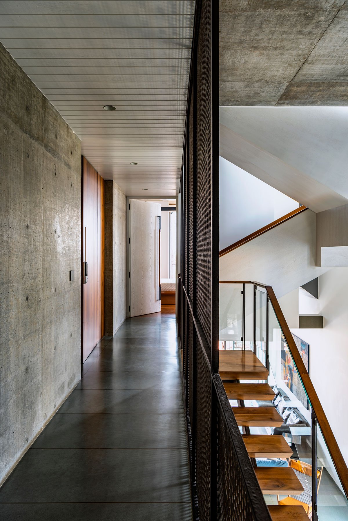 The individual “bungalows” are planned around central north facing courtyards with the public/private spaces located at the east and west zones to establish views into the funnels between the surrounding buildings. The individual courtyards bind the internal spaces and allow for natural light and breezes to flow through the house, behaving, in the hot months, like a thermal stack. Internal shifts in space and structure make the courtyard extend into the private spaces creating a network of deep voids and punctuated skylights. The sensation of living under the sky permeates through the house.