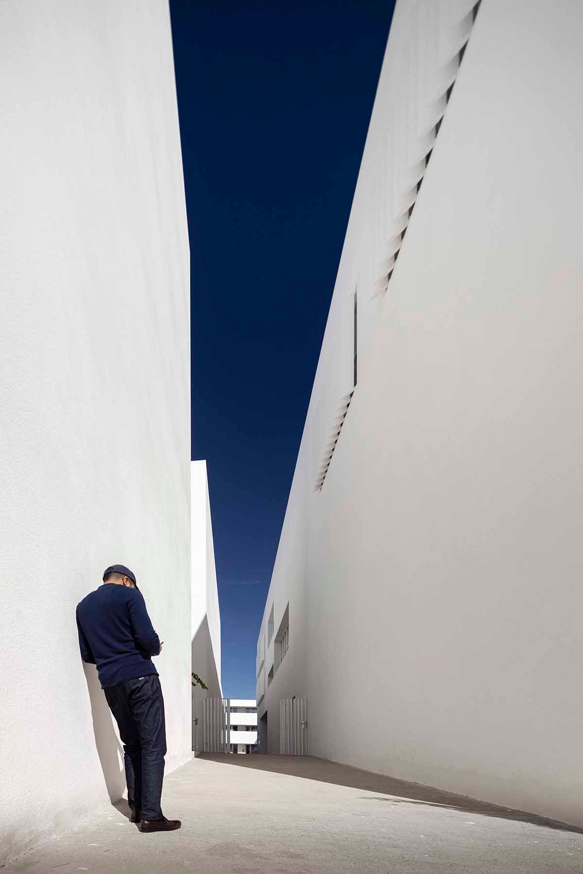 The volume composition allows the maximum possible views through framed perspectives. A landscape layout between the main volumes and the adjoining roads allows for protecting somehow indoor spaces from sunshine and urban noise.