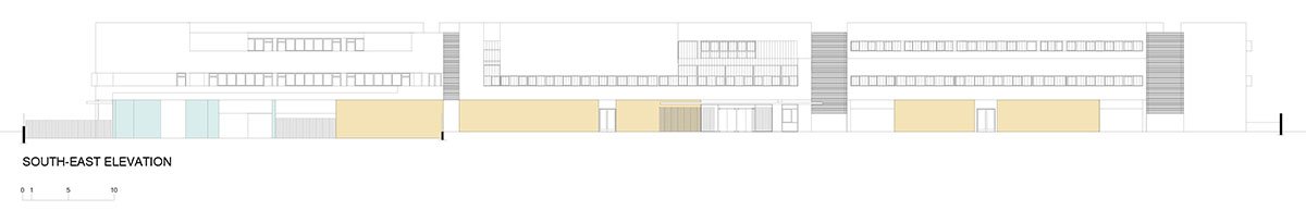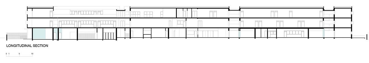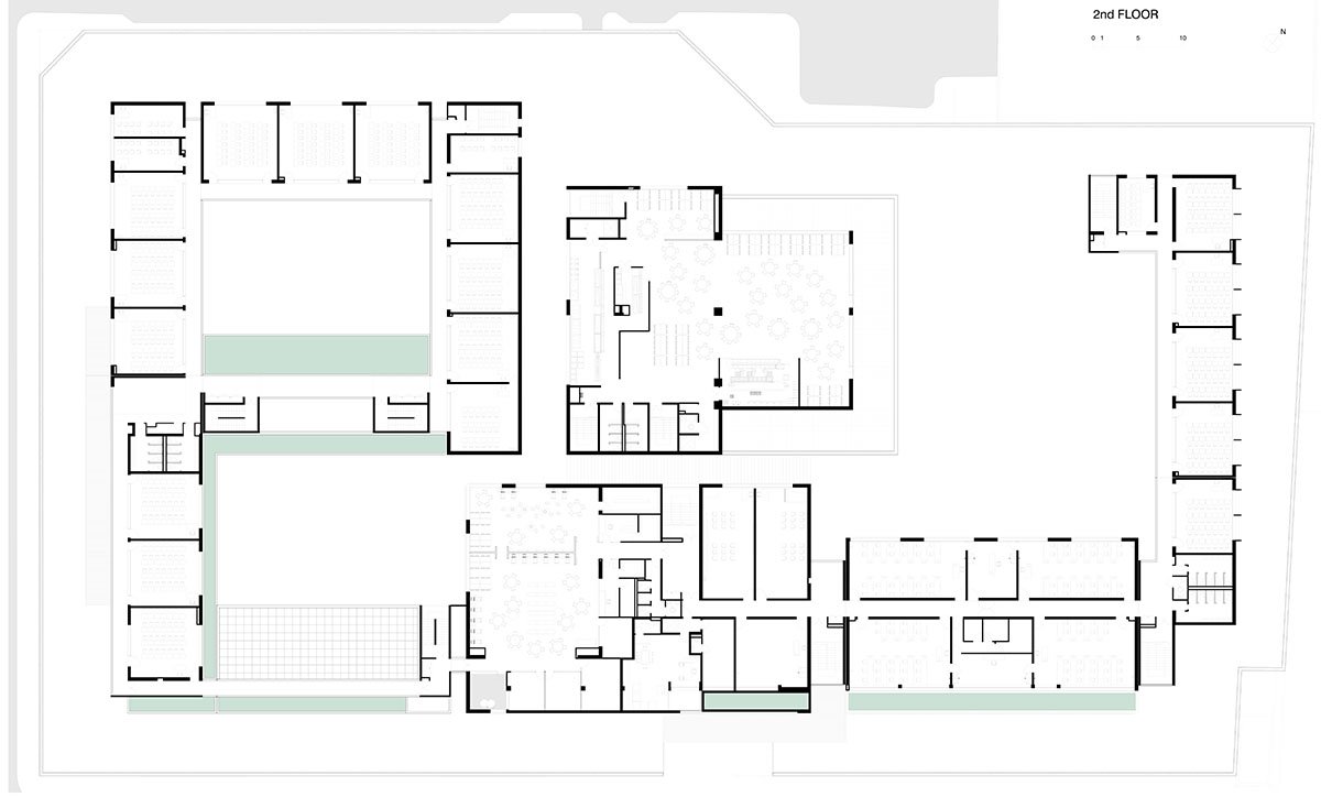 The secondary school is located on the northeast side of the plot. It is articulated in an L-shape, which frees maximum space for the playground and the outdoor sports area. The central area of the plot is occupied by the support functions, which are linked together by a set of corridors on the ground floor and the upper levels.