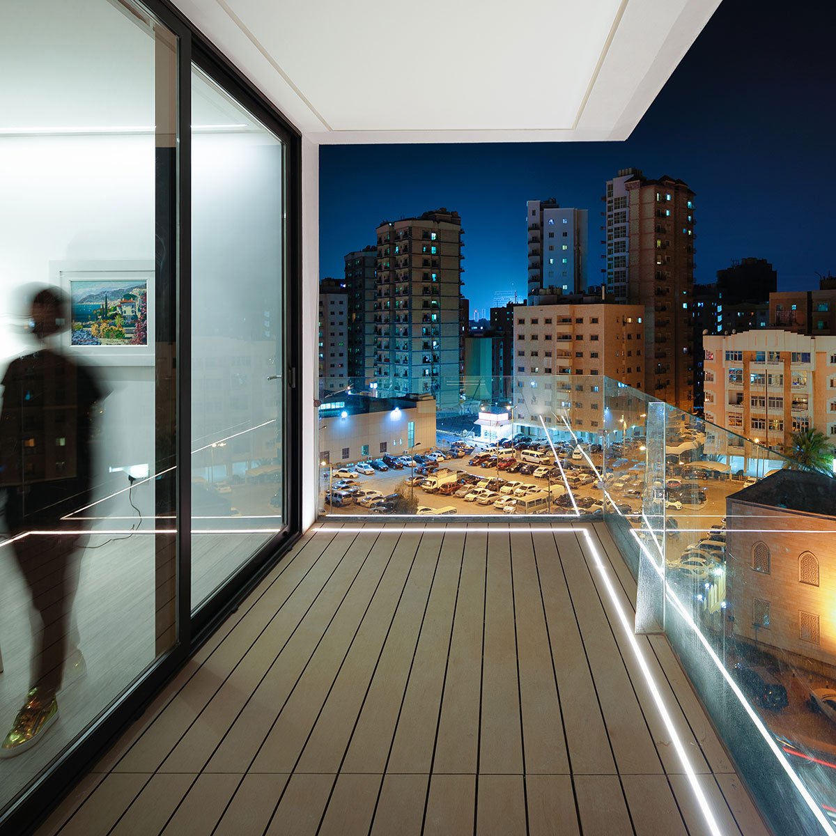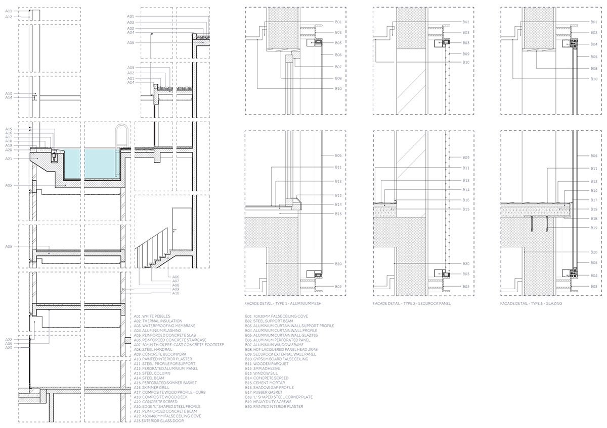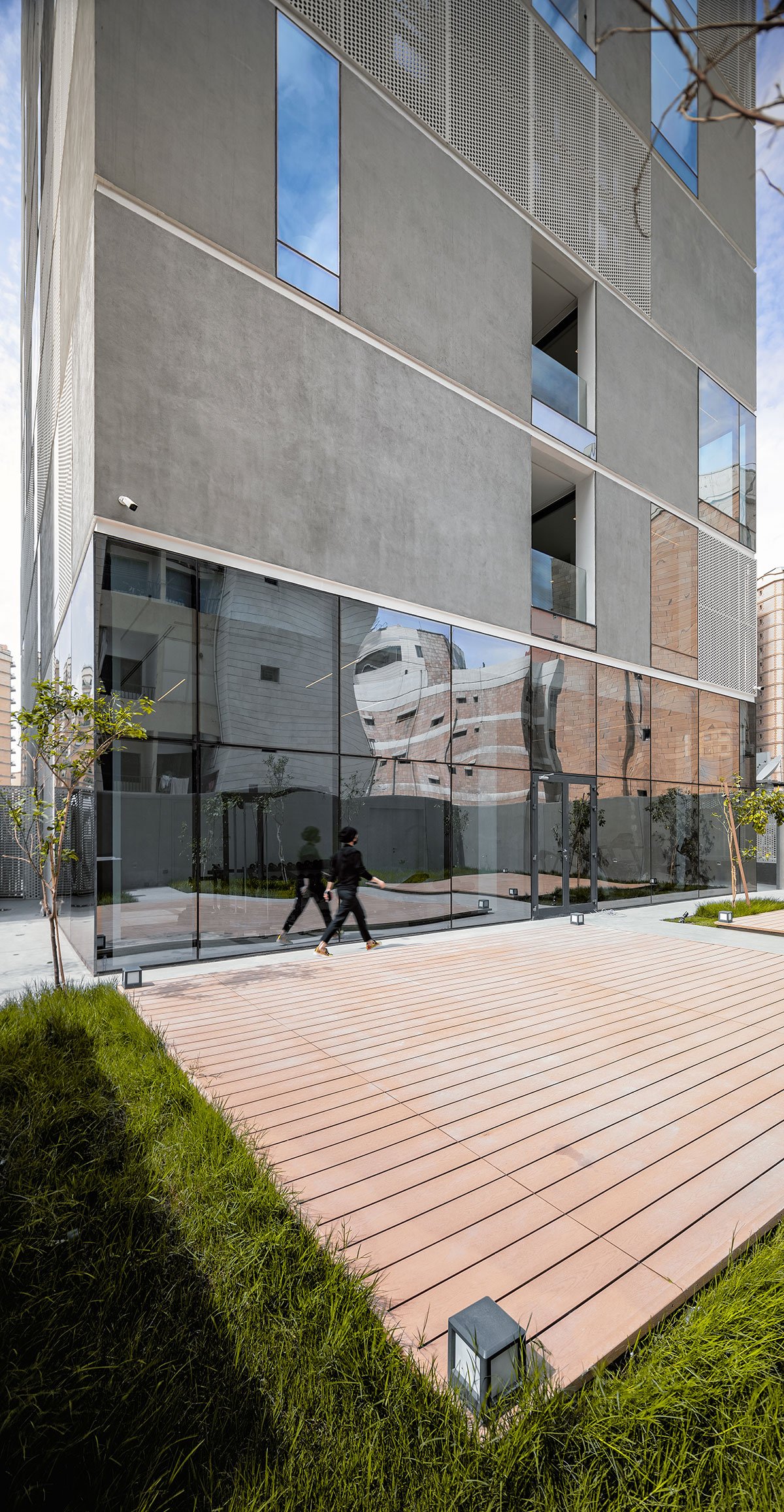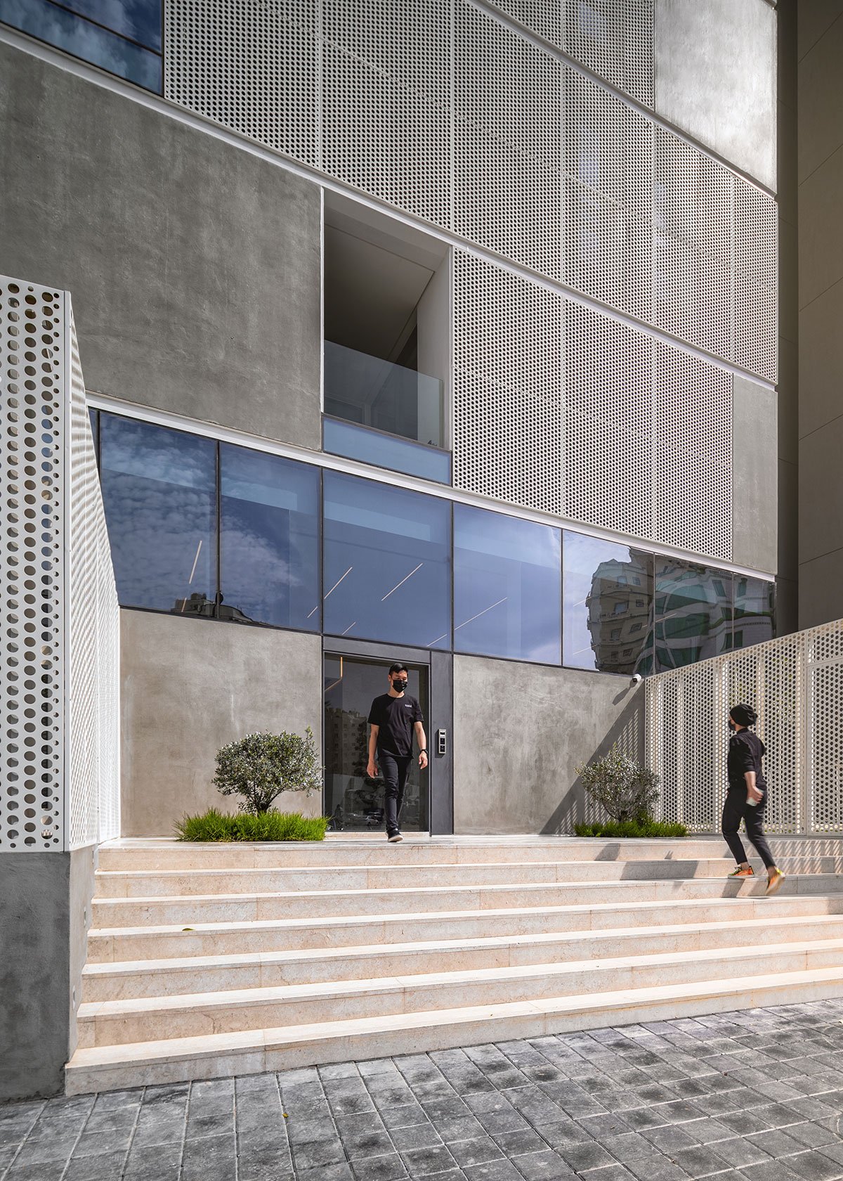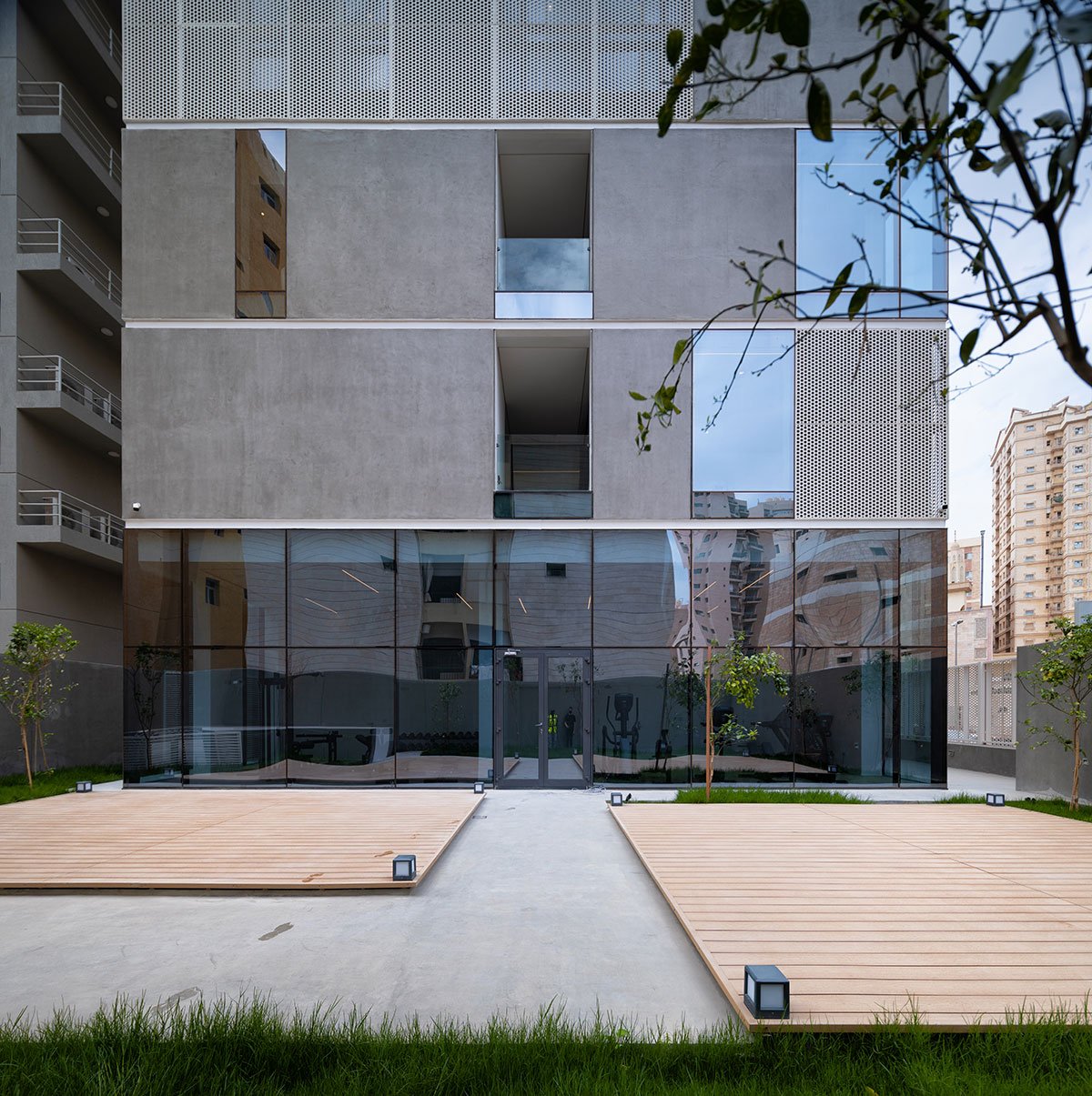 The proposal follows a strict philosophy aimed at giving the optimal environmental response to the Kuwaiti climate. In this aspect, the architects decided to use passive systems to generate microclimates within the apartments. A careful analysis of the sun’s movements and the height of surrounding buildings helped develop the facade by employing strategic subtractive operations. The perforated metal cladding with a weatherproof coating acts as adequate thermal protection, along with the insulated concrete panels, to withstand the harsh desert climate.
