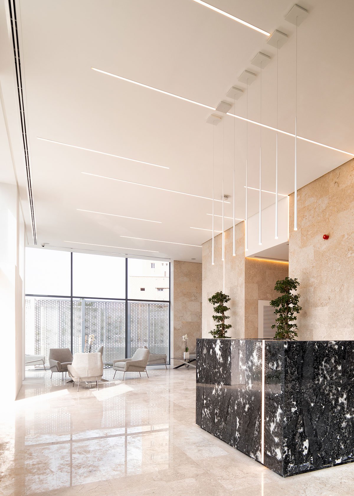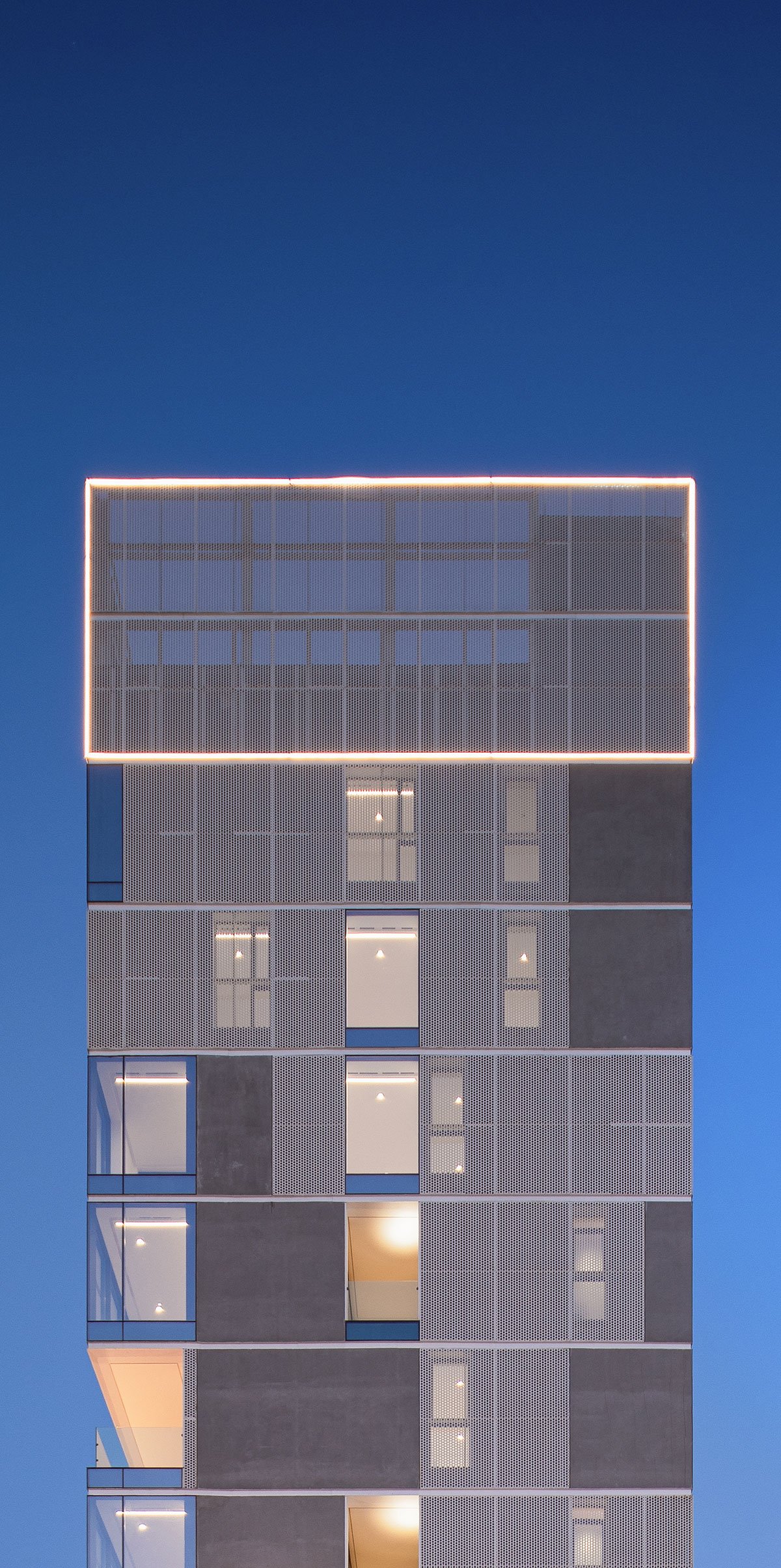 The individuality expressed in the floorplans translates into the facades, creating a staggered composition that brings lightness to the tower volume with the dialogue between concrete, glass, and perforated metal panels. The north and west facades incorporate considerably larger openings to take advantage of the open views. While the south and east facades, restrained by neighbouring building proximity, have more controlled apertures, becoming critical factors in the façade variations.