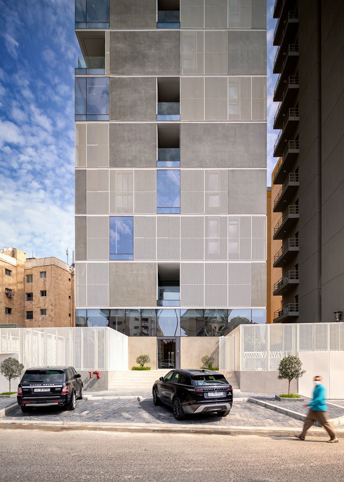 [Text as submitted by architect] Jade is a midrise multi-unit residential building in Salmiya, Kuwait, that houses 20 independent residential units. Built on an 813 sq m plot, the building has a double basement parking, an open-plan ground floor with a gym and kids play area, 10 stories of residential units, and a rooftop social space with a 15m long pool and barbeque area. The exterior envelope of the building is a composite skin of light concrete, perforated aluminium panels, and high-performance glass panels. The design of the building aims to facilitate an urban and sustainable way of living for young families.