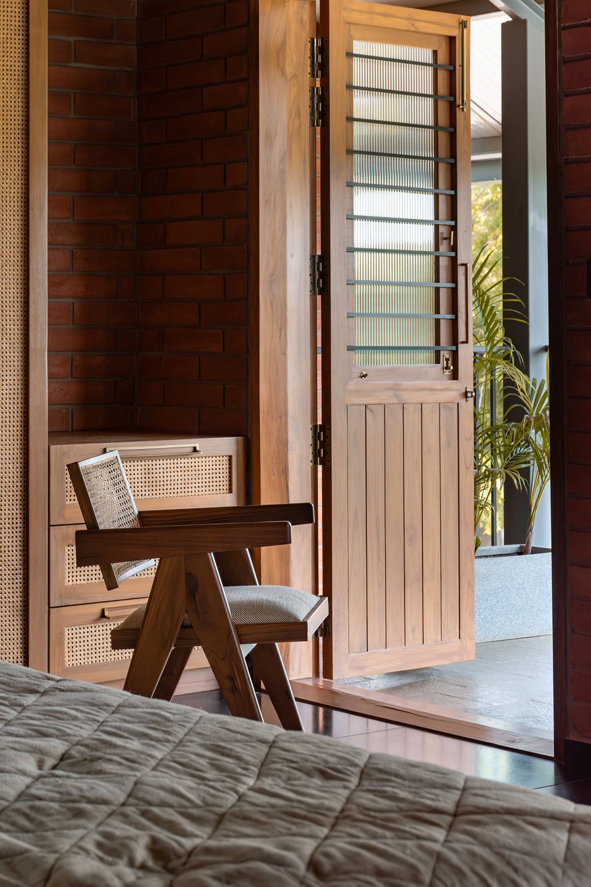 The home features 9 inch thick load bearing walls made out of compressed stabilized earth blocks coupled with a hybrid steel and concrete structure. Using CSEB for the walls allowed the spaces to harness the thermal properties of the earth and keep the interior temperatures cool. The roof, supported on a steel structure sits higher than conventional height which increases the volumes of the bedrooms allowing comfortable temperature at all times.
