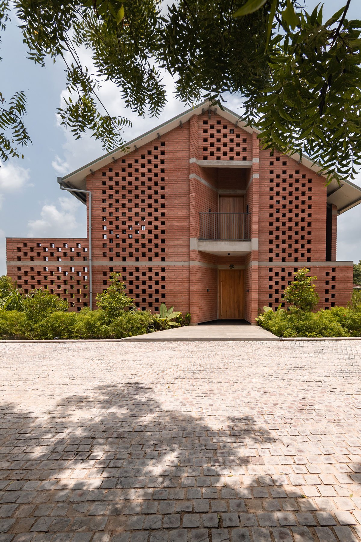 [Text as submitted by architect] The Jalmanjar farmhouse sits at the periphery of a 12.5 acre farm on the outskirts of Ahmedabad. The gable end of the jali wall is the first sight as one approaches the home through the tree canopied internal road of Jalmanjar. This perforated envelope of Compressed Earth blocks sheathes the house from the direct sun while allowing the wind to breeze through the wind catchers inside.