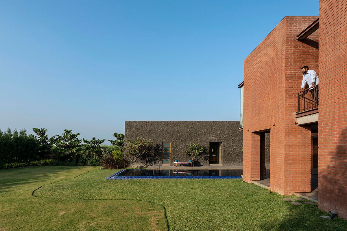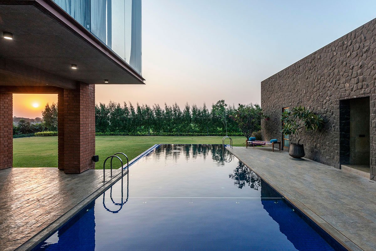 The spaces between the blocks are shaded by the southern block, which is higher than its northern counterpart. It allows the flow of cool south-west wind filtered through trees and a pool that leads the public area and activity space. It hosts a semi-open deck with columns within the pool. The central courtyard contains an open staircase going to the upper floor of the southern block, where a threshold space develops the frame of lush green farm. Various pockets have been created that aims to balance the layout of different void and solid mass. Respecting the context, we kept the material pallet very subtle and used expose concrete(gray), Mud Brick(Gerua), Wood(brown), and Stone(Dark Gray). Hence it gave the house its belonging in this green lap and made the surroundings look more prominent and as the primary design element.