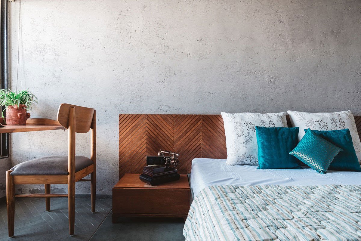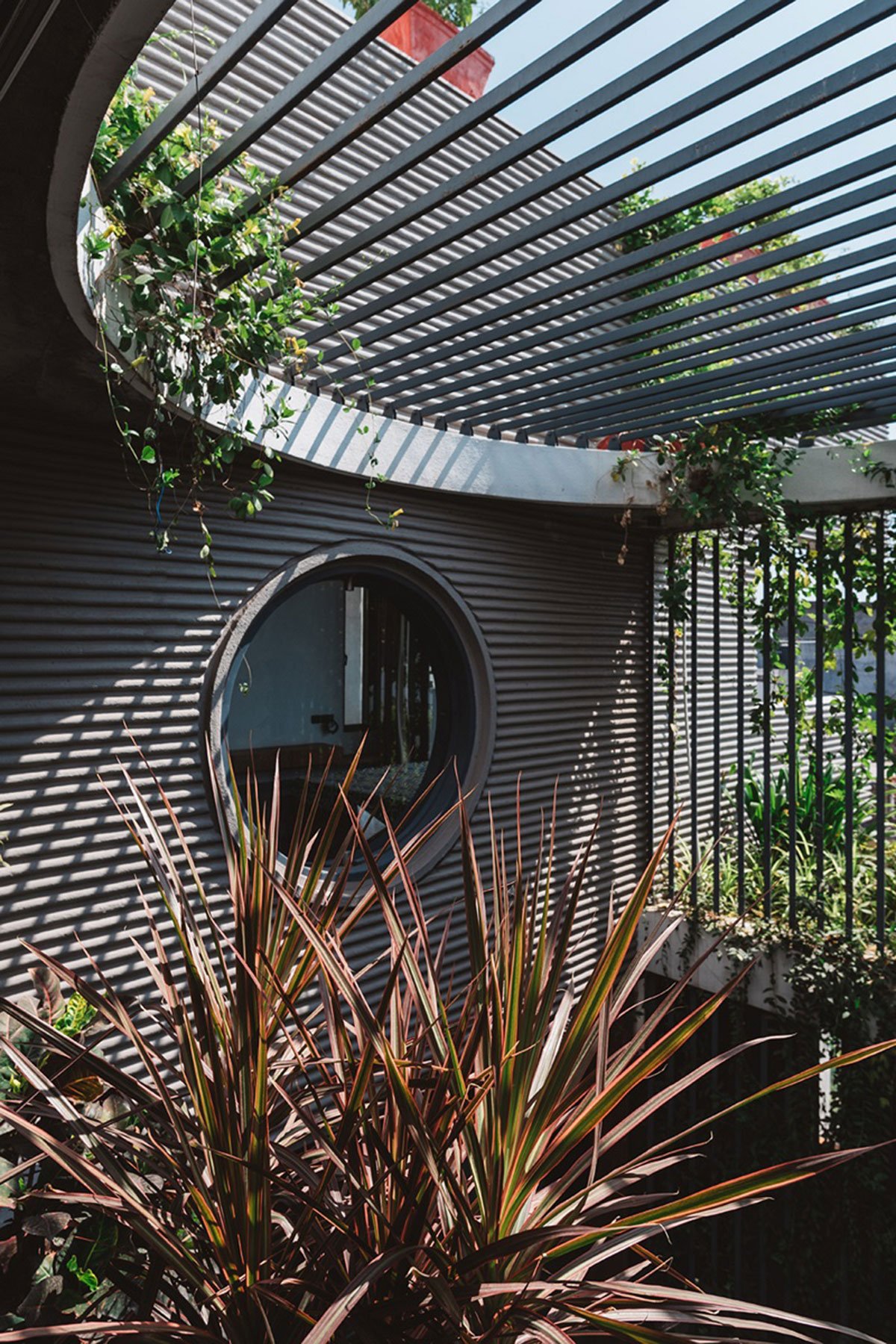 The heart of the structure is the double heighted courtyard which is embellished with creepers and climbers. The green curtain cuts the direct entry of west sunlight inside the house and creates a buffer. The view from the spaces offers a glance of voluminous courtyard. The shape of the temple is evolved from the form of Shikhara – a feature ofHindu temple architecture. Templewith triple height factor acts as a wind tunnel with mechanical exhaust fan. Circular windows in bedroom, out looking the landscape serves as a natural picture frame. The basic building materials are kept to its natural form and texture to comprehend the naturality of flora.
