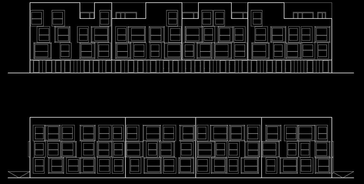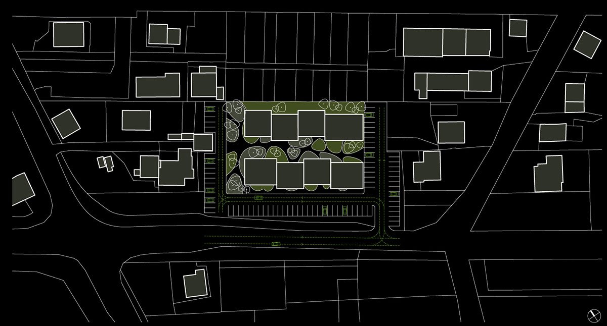[Text as submitted by architect] Two buildings with fifty residential units are located directly on the Jurčkova Street in Ljubljana. In accordance with the urban planning regulations, the apartments are arranged in two tracts parallel with the road, and are three and four floors high. Both buildings, planned by the spatial planning documents, are situated in the neighborhood of predominantly single-family houses and, due to their size, stand out significantly from the sizes of the surrounding structures.