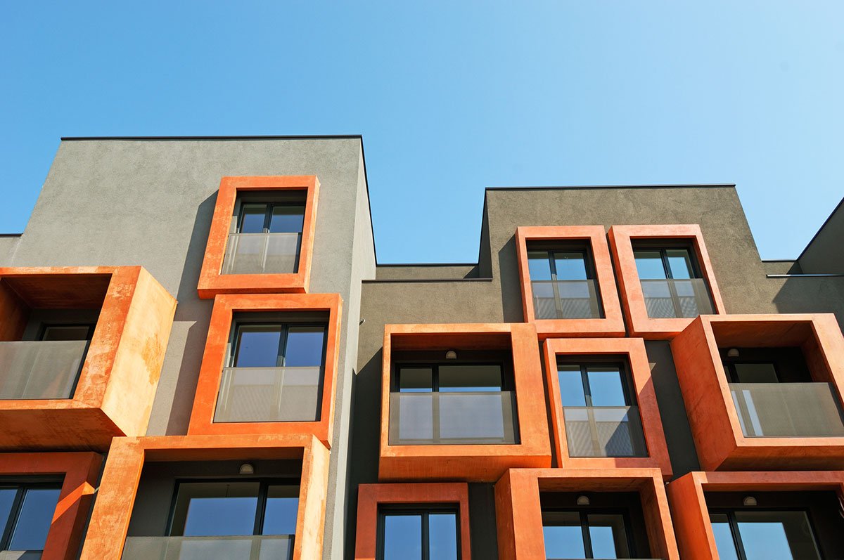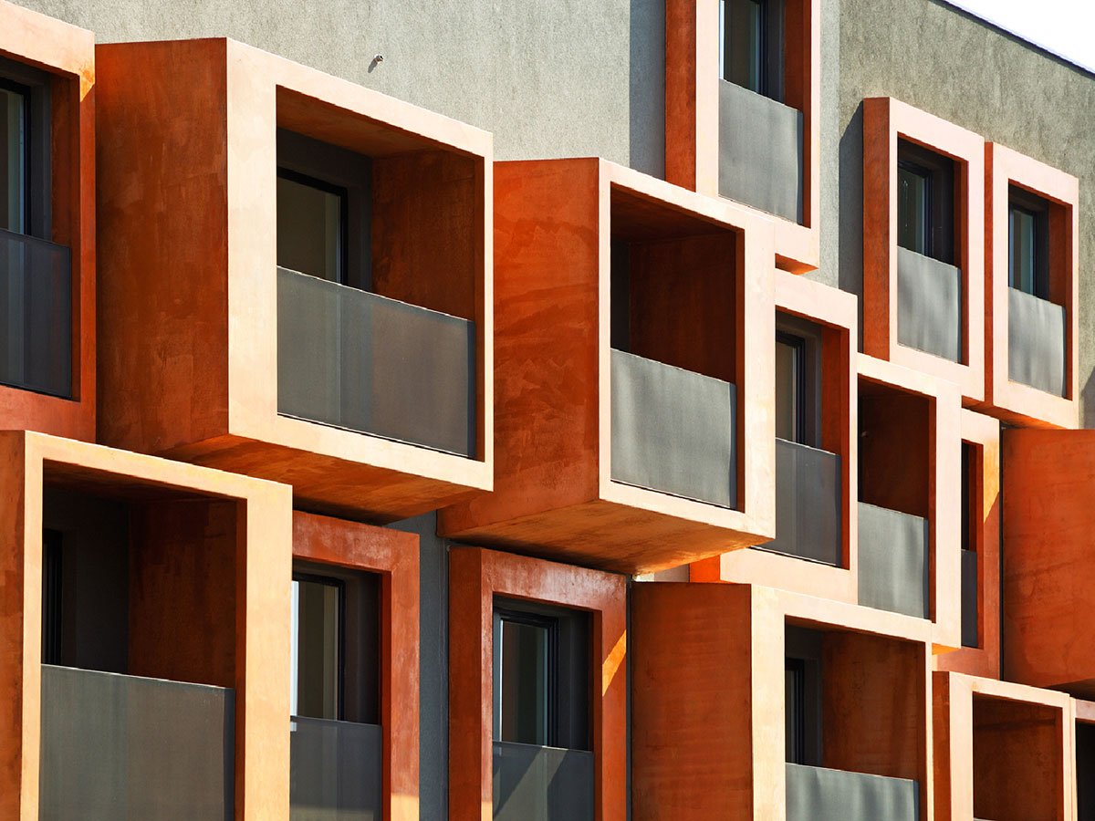 Concrete is colored before the production of prefabricated concrete elements and is additionally chemically treated thus weather resistant and requires no additional mechanical protection. Conical shape of the loggias and window frames is conditioned by the production technique, enabling it to pull heavy prefabricated elements from the mould. Slightly rough effect of the concrete loggias is adjusted to the street criteria. Looking at the units from afar, loggias seem playful and light, while strong enough to override any form of intervention and decorative accessorizing by the residents.