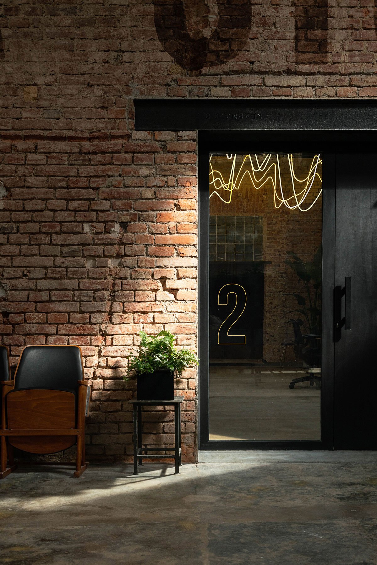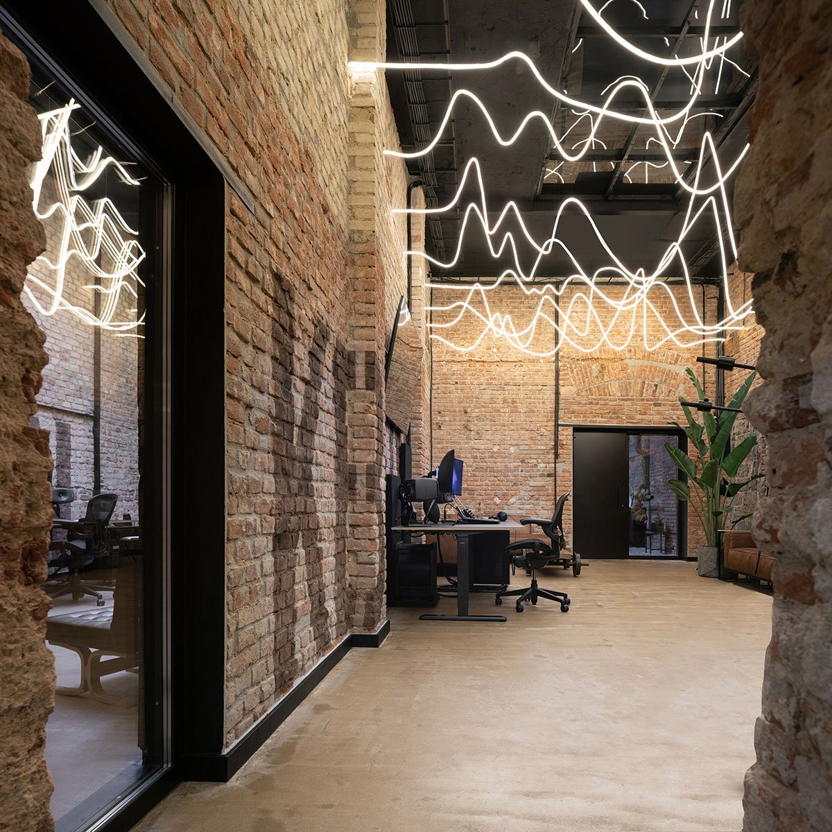 The neon lights, designed by the architects, are also a nod to the studio’s function. A visual of the large warm sound waves that dominate the ceilings of the recording studios and constantly change as they move through the space. These delicate structures are adorned by a neon number assigned to each studio and invite the artists to explore the room.