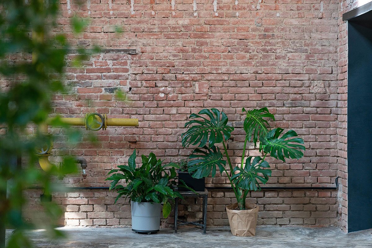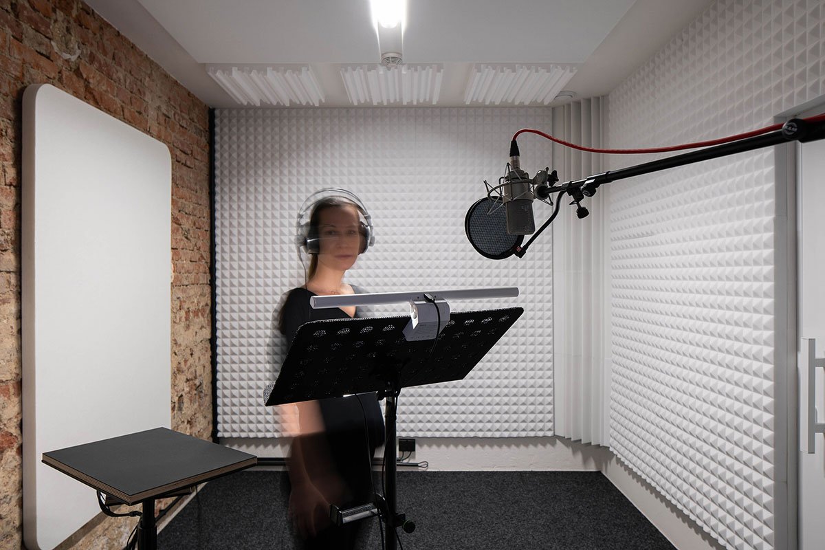 The “living room” is dominated by a Bomma Orbital chandelier that floats above a massive wooden table, further enhancing the space’s sense of height. The plants, which freely establish themselves over the black walls, separate the reception from the rest of the hall’s inhabitants and are housed in carefully concealed planters. Each recording studio is equipped with a white voice-over booth.