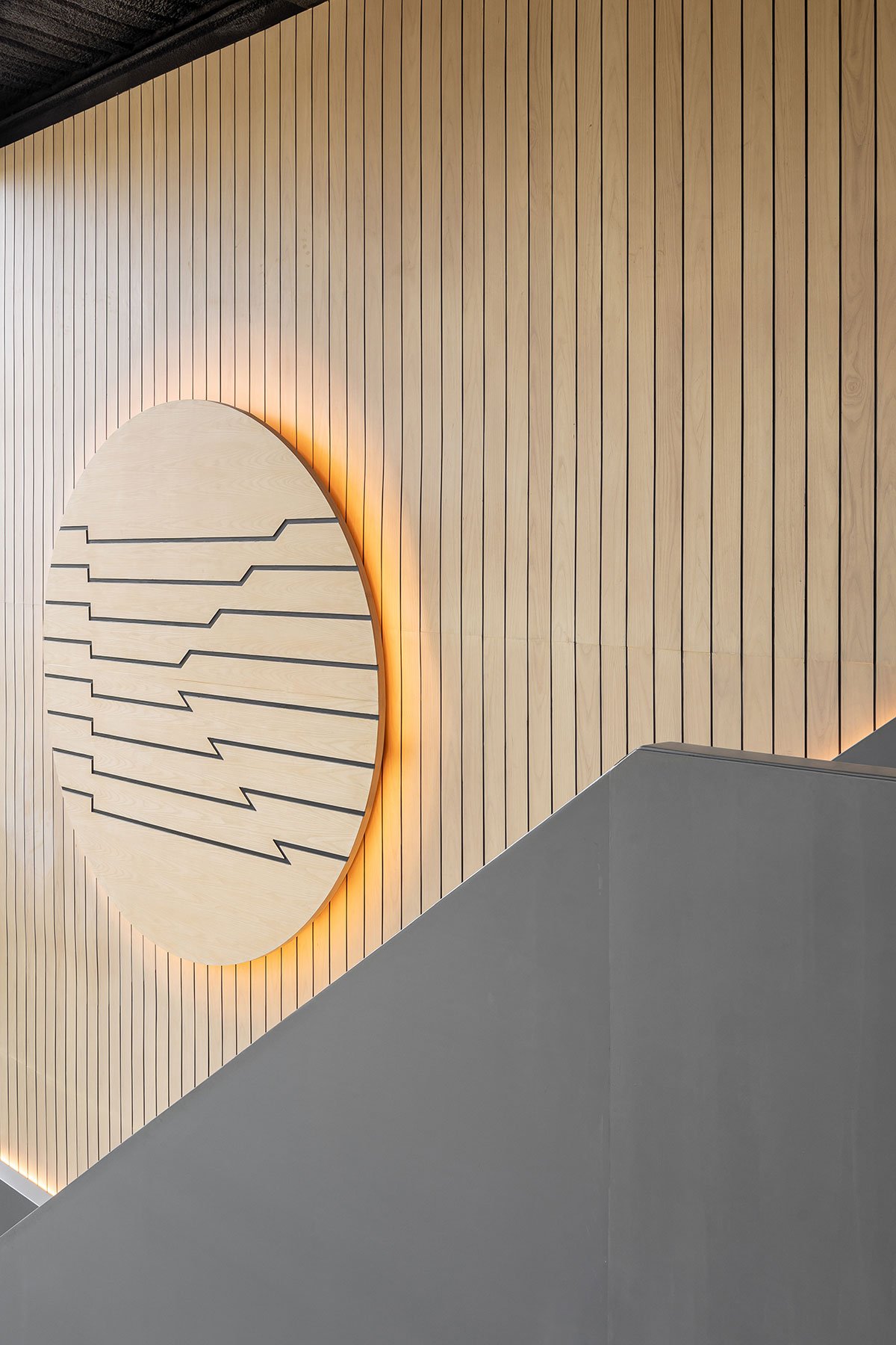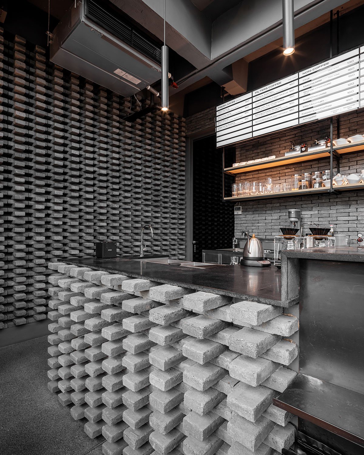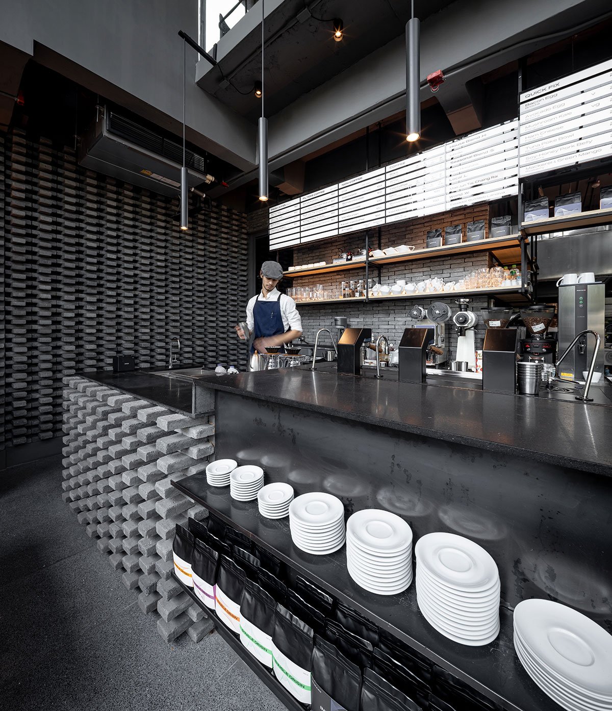 The natural finish oak woods and dark grey bricks opted as the main principal materials. The result is the harmonious combination and beautiful contrast of the structure at once. While the oak woods transmit a sense of cosiness, the dark grey bricks bring about sophistication to the interior space. The distinct brick pattern was installed at the counter bar and the first-floor wall, adding the design details as well as exceptional character to the space.