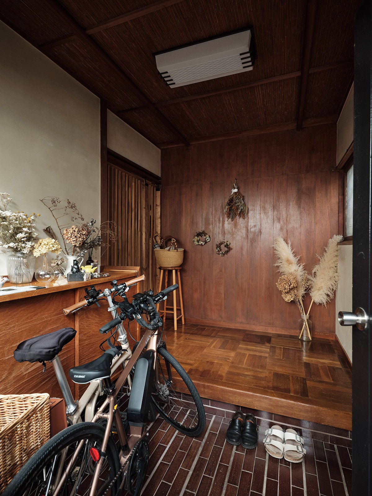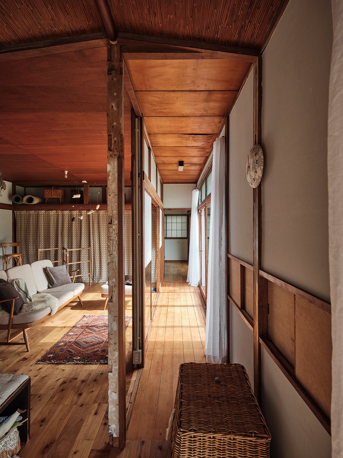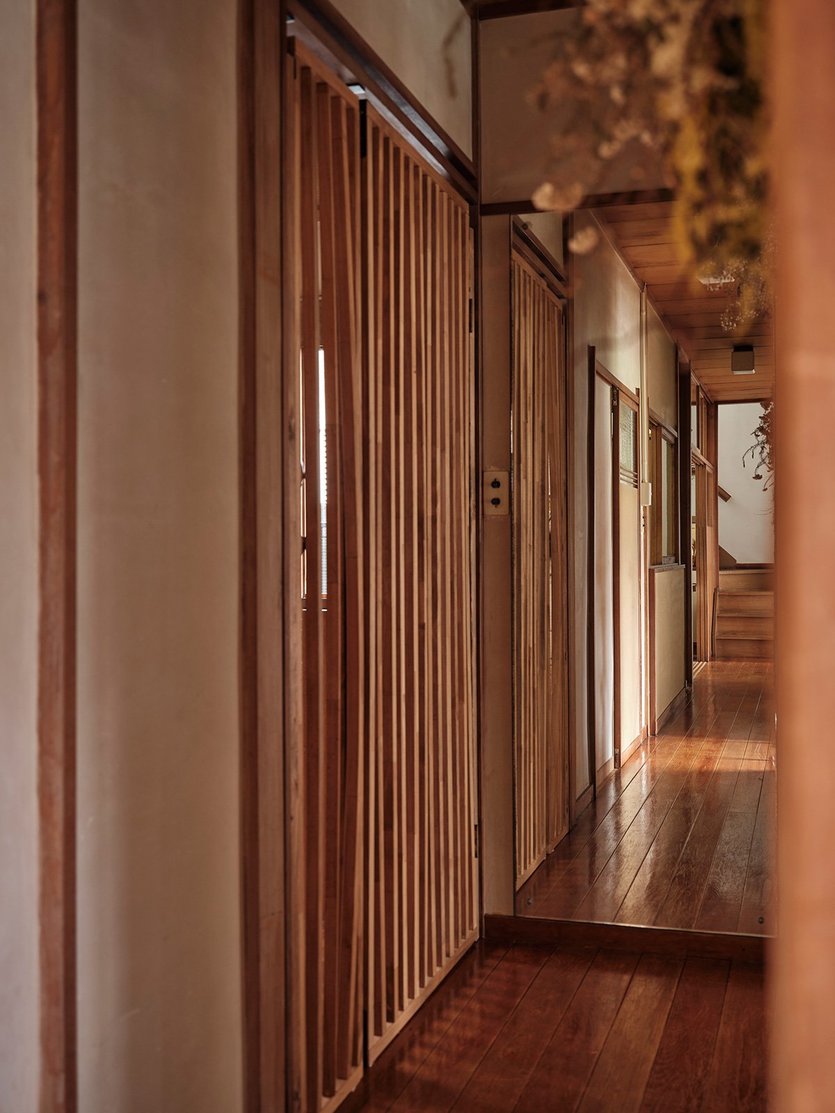Along the Engawa corridor, the shoji-lined walls were kept in place, and the original ceiling boards were preserved. The newly connected ceiling areas were finished with new wooden panels, creating a gentle contrast — a patchwork of materials and time. The same flooring continues throughout, tying the spaces together in a continuous flow.