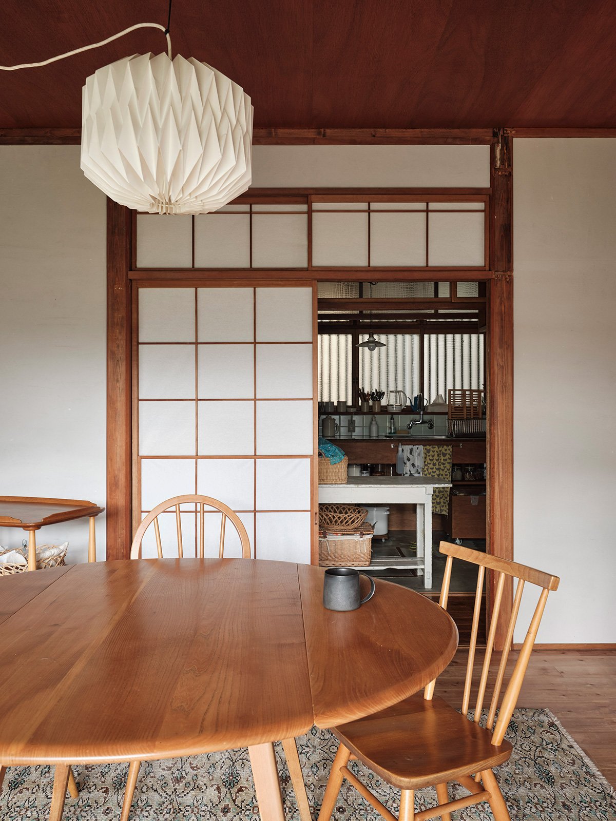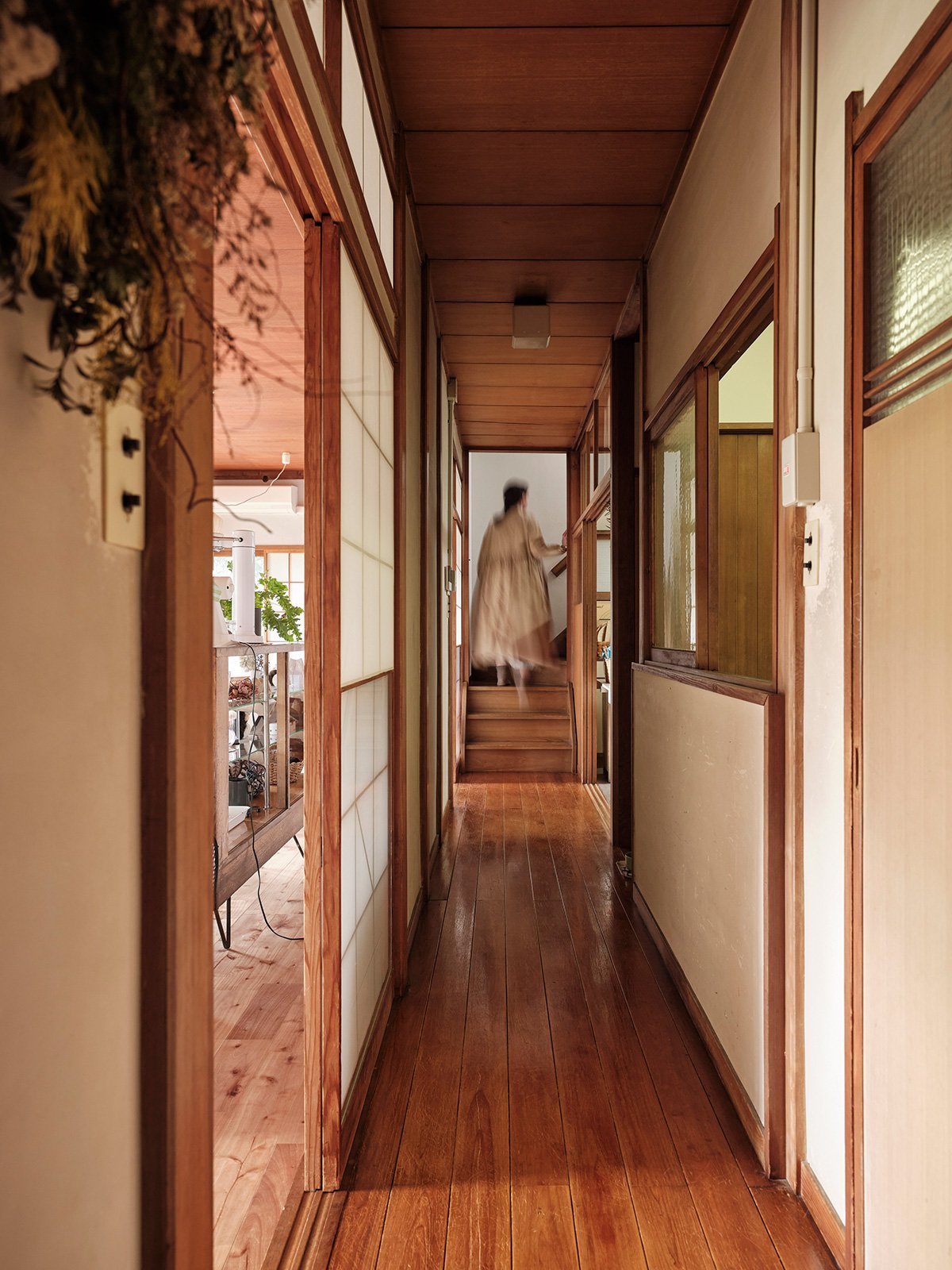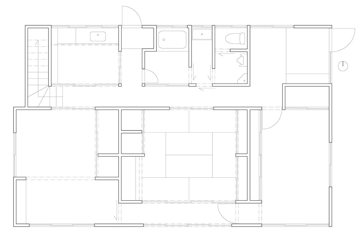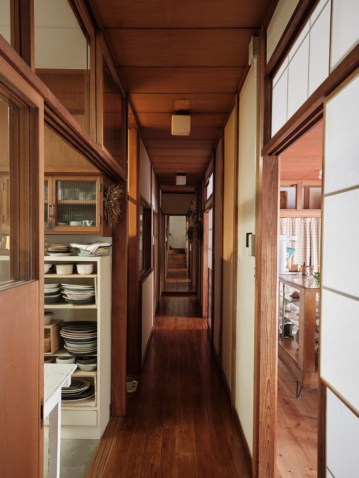 Along the Engawa corridor, the shoji-lined walls were kept in place, and the original ceiling boards were preserved. The newly connected ceiling areas were finished with new wooden panels, creating a gentle contrast — a patchwork of materials and time. The same flooring continues throughout, tying the spaces together in a continuous flow.