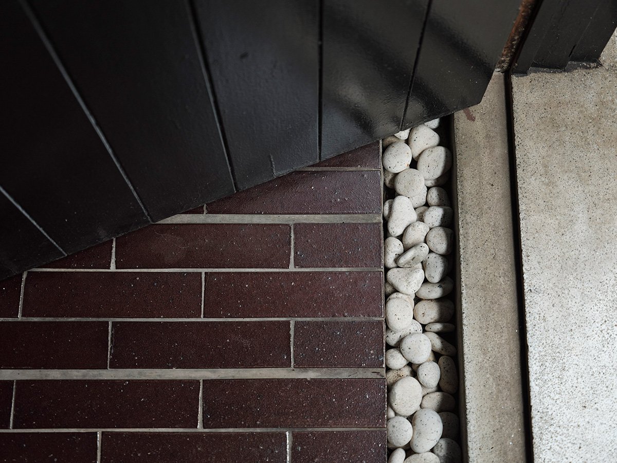 Entrance and Flow: The renovation began from the exterior, which was repainted black, with the entrance door and windows finished in the same tone to create a unified appearance. Inside, the entrance retains one of the house’s most distinctive original details: a narrow strip of smooth white pebbles placed between the reddish floor tiles and the concrete step.