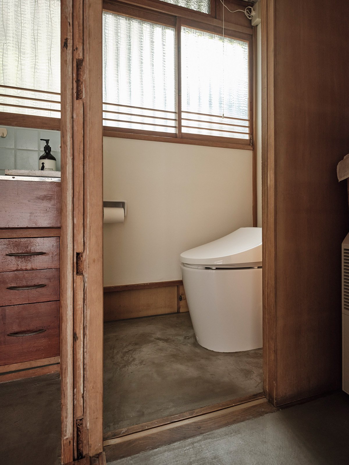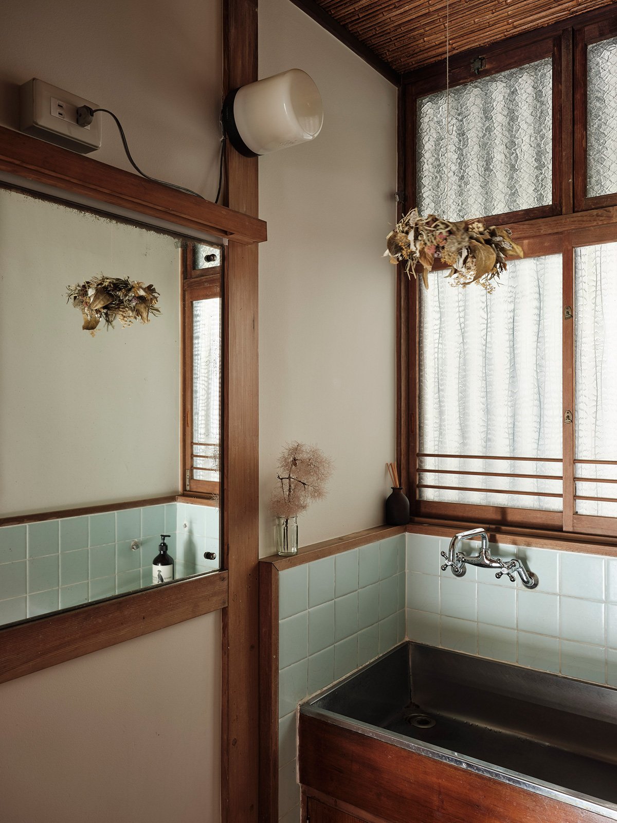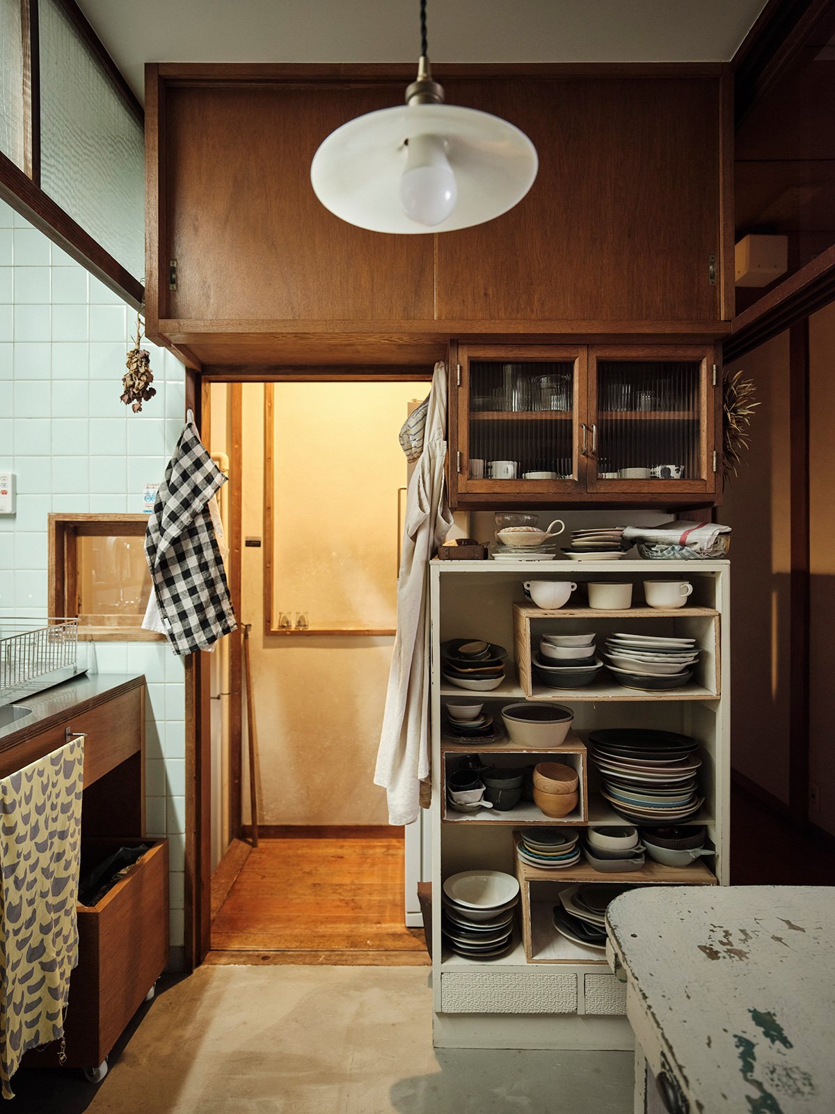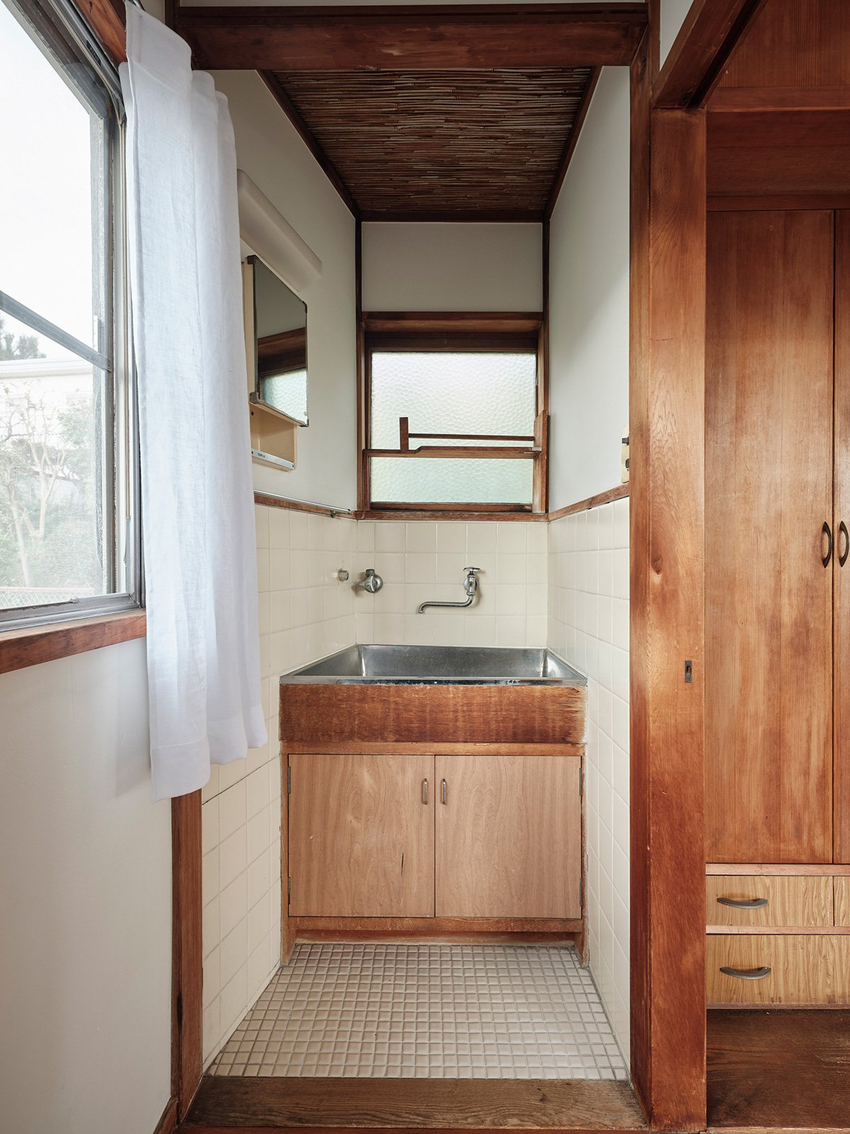 When matching replacements couldn’t be found, new white tiles were added intentionally as a contrast, highlighting the relationship between old and new. The floor retains its original tamaira tiles, creating a textured and layered impression — a quiet mosaic of time and care.