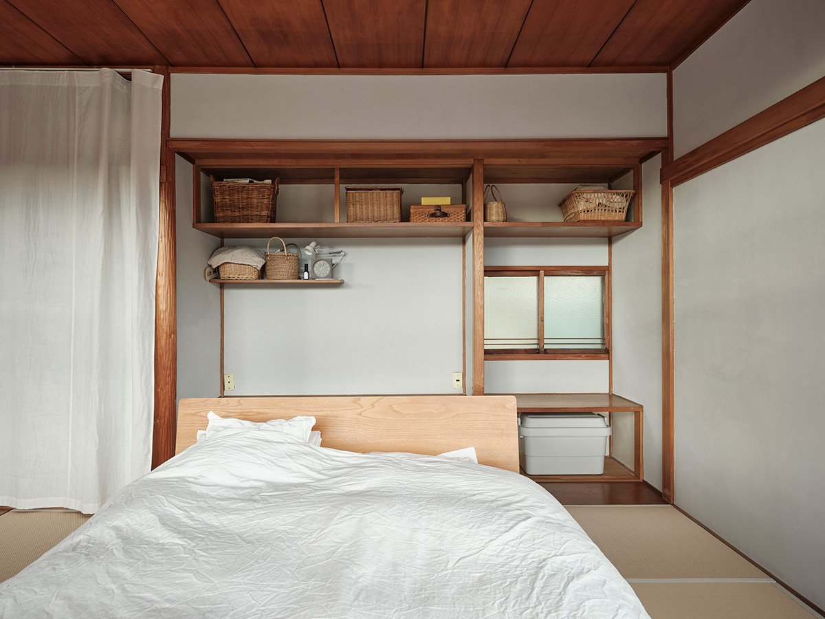Living and Evolving: Upstairs, two smaller rooms were merged into one large, open bedroom. Natural light fills the space through the wide windows, and the oshiire closets from both rooms were combined into a single, continuous storage area.