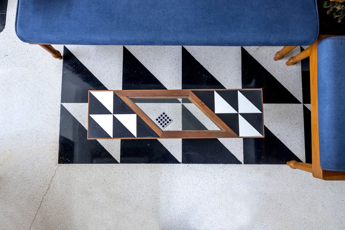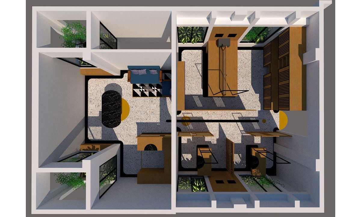 There are tables hung from the ceiling and the design of the flooring reflects the elements of furniture in the space. Spatially, the space is designed to create elements that are floating so that overall the space does not look cluttered.
