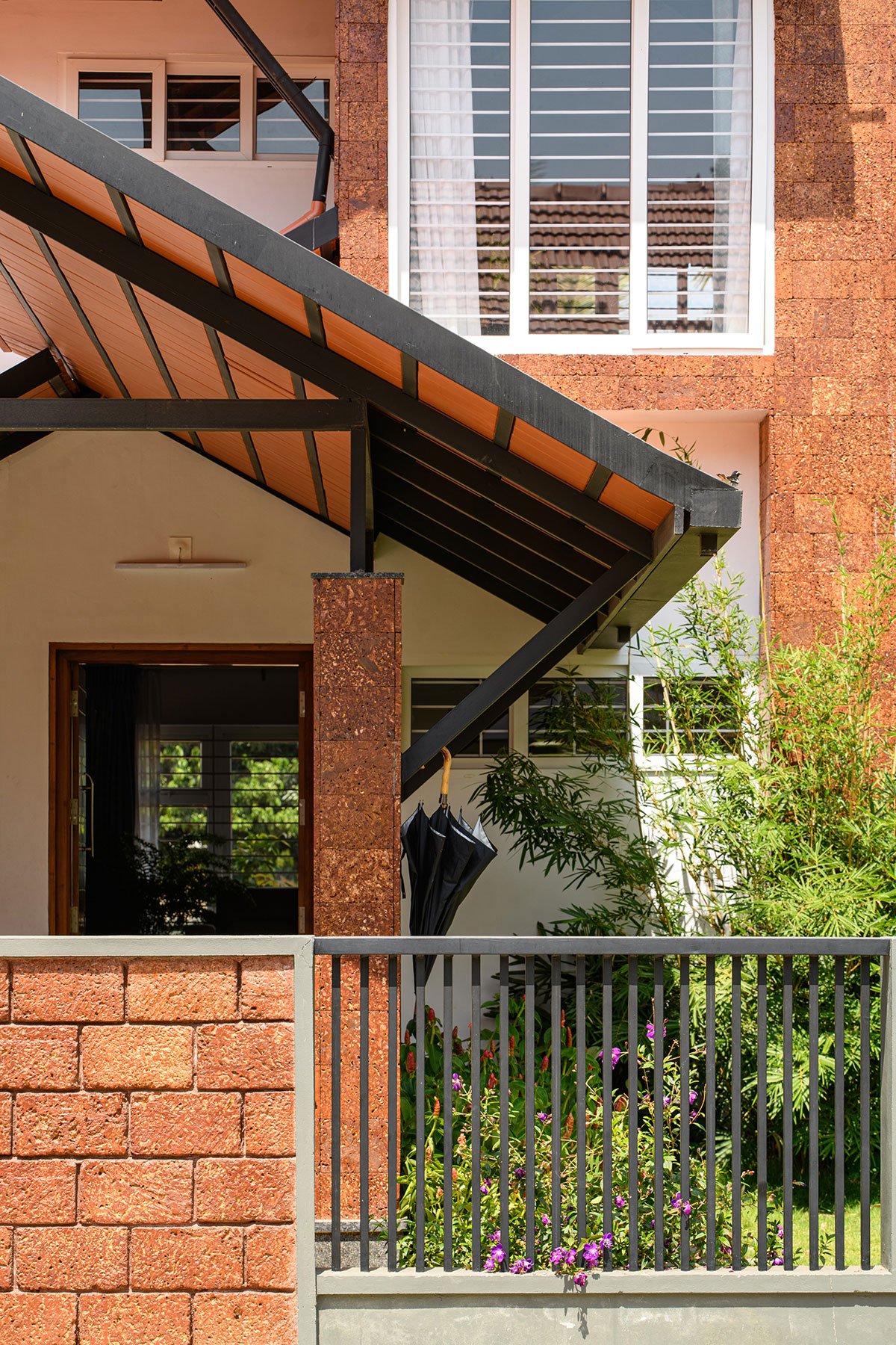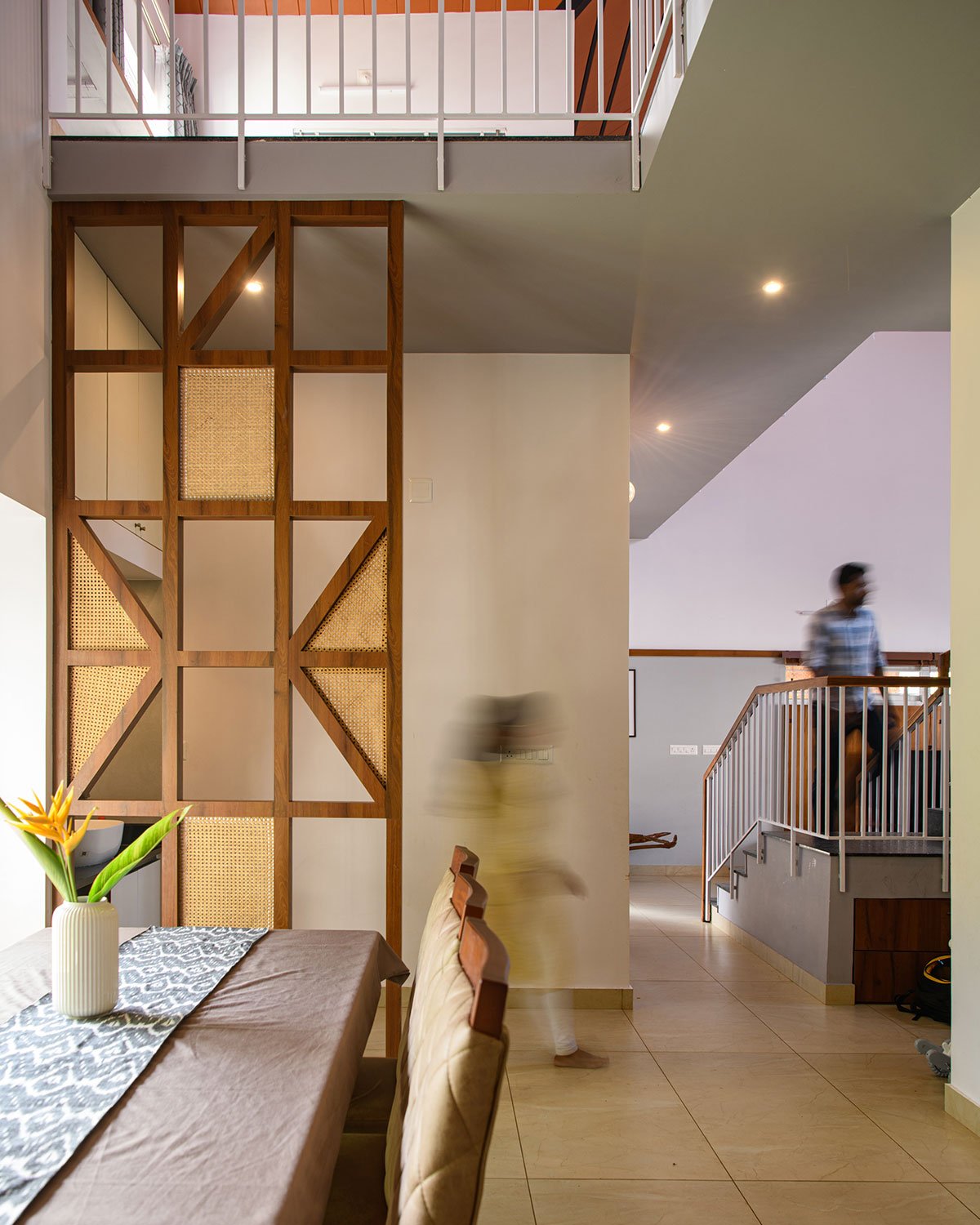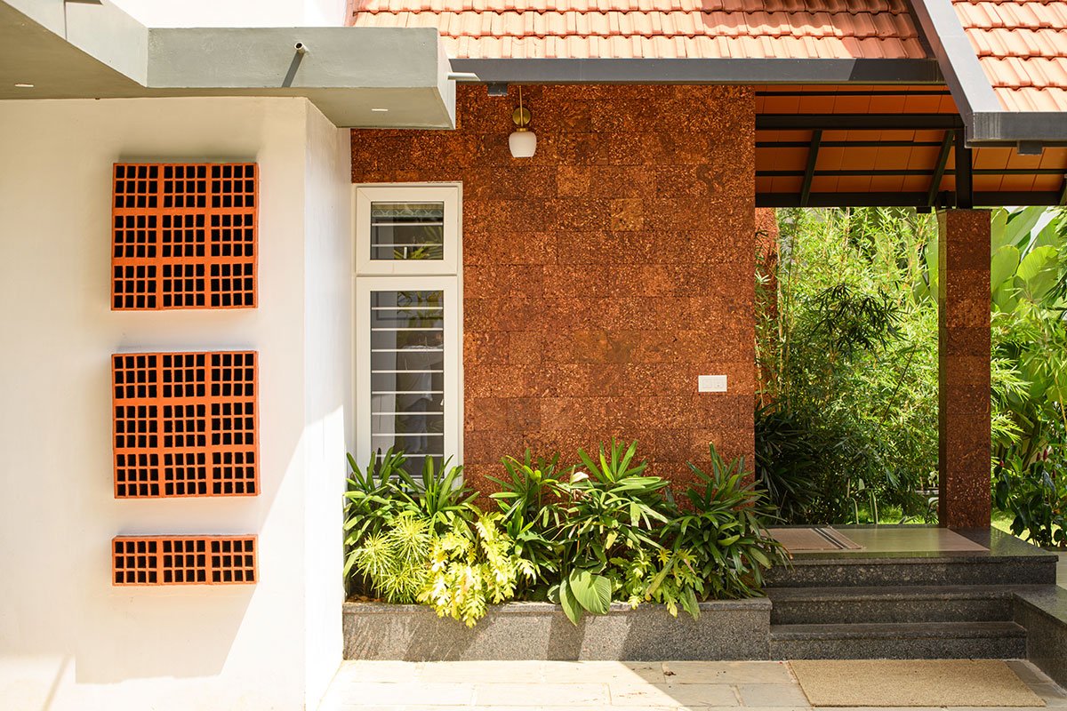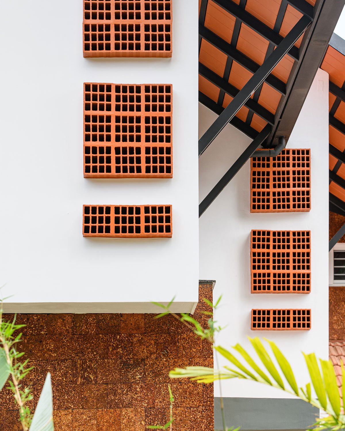 Key architectural elements include perforated walls, which not only enhance the visual interest of the structure but also facilitate ventilation and the play of light and shadow, contributing to a tranquil and balanced atmosphere. Large openings throughout the home maximize views of the surrounding landscape, creating an expansive and interconnected living experience. These openings are strategically placed to frame picturesque scenes of the greenery outside, allowing the natural beauty to become an integral part of the interior decor.