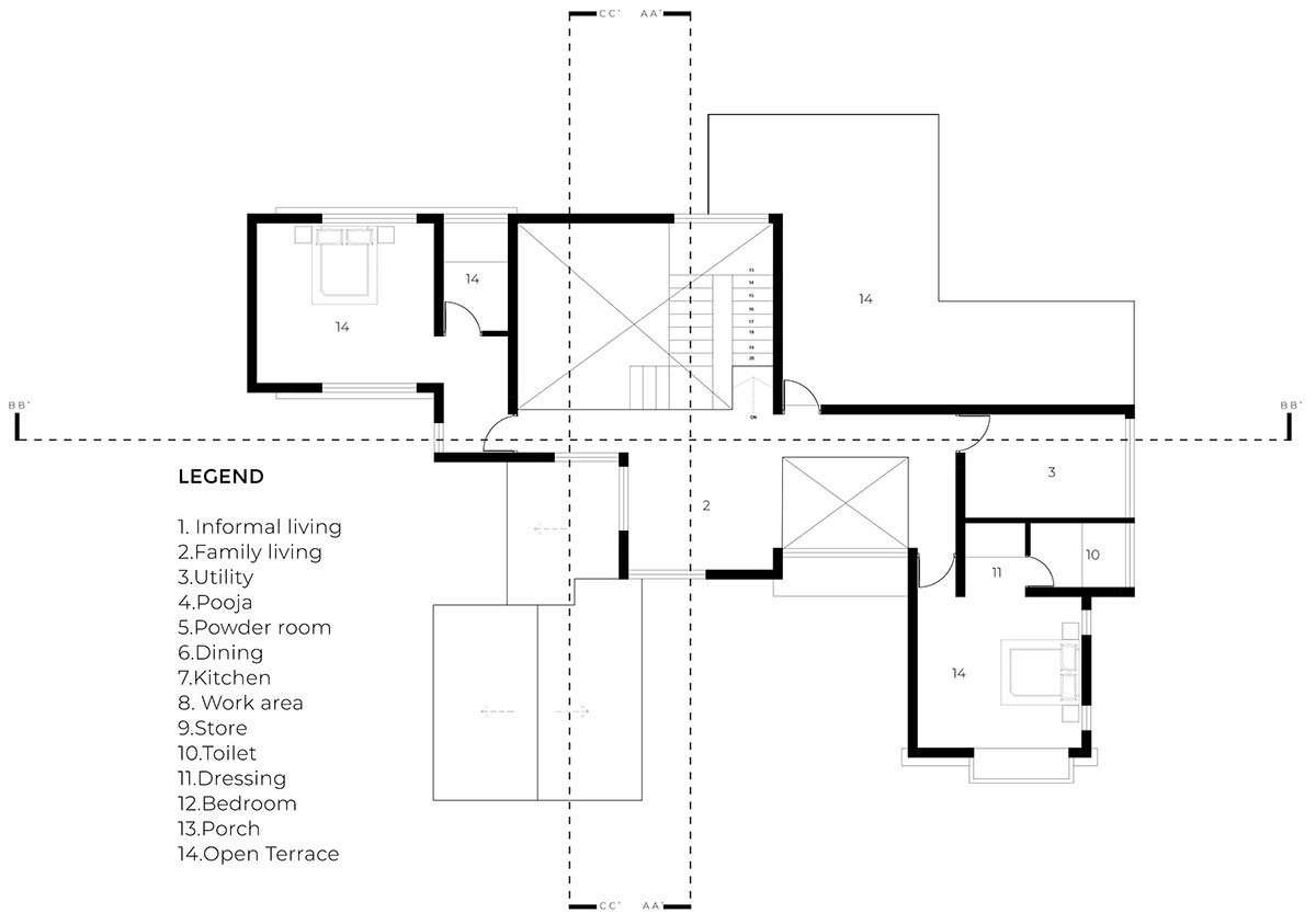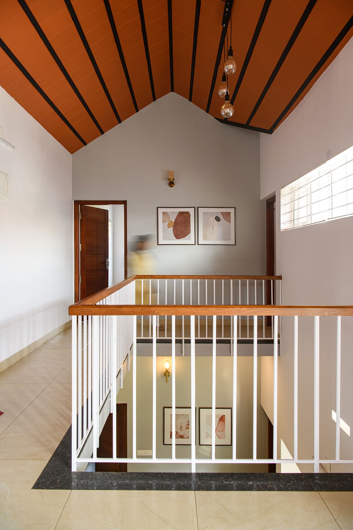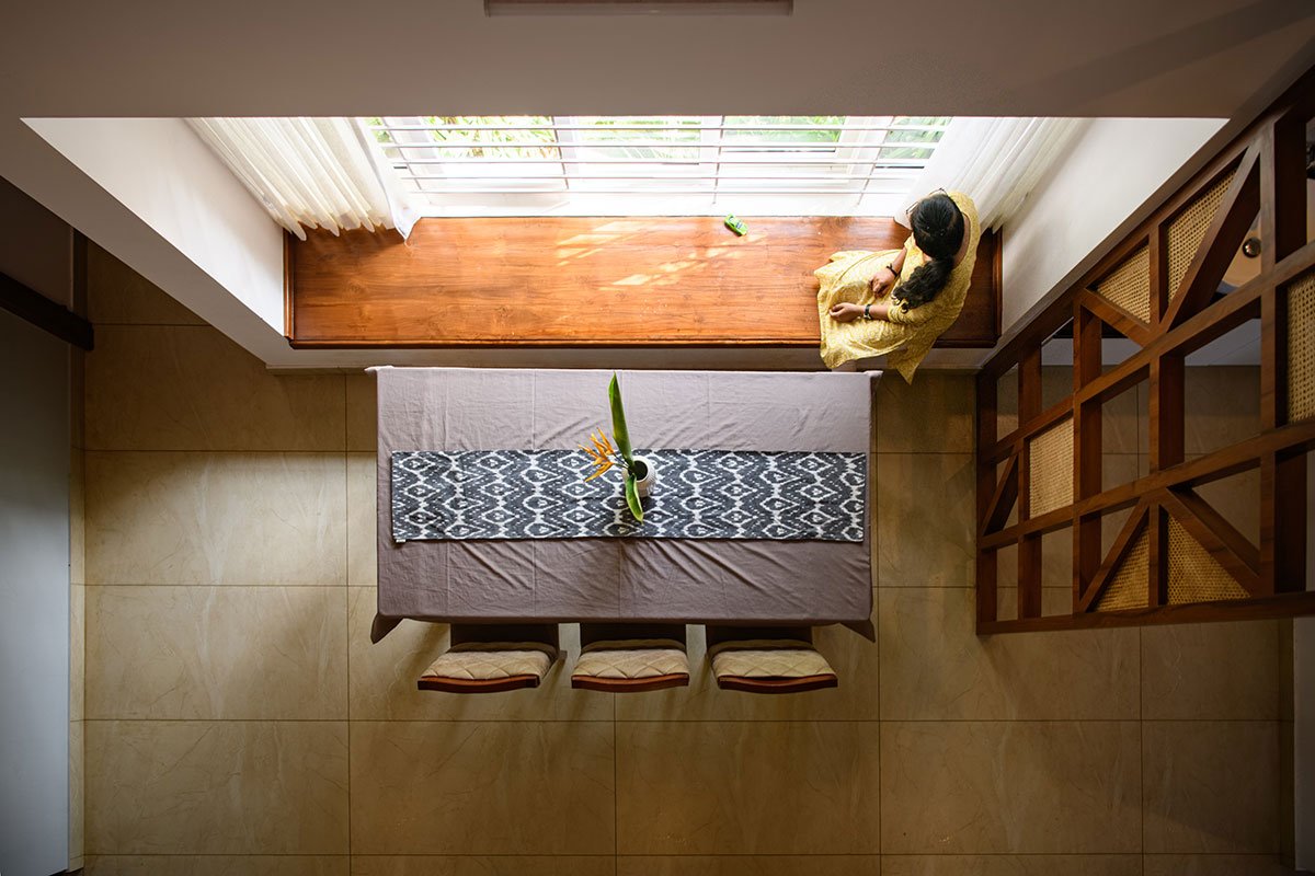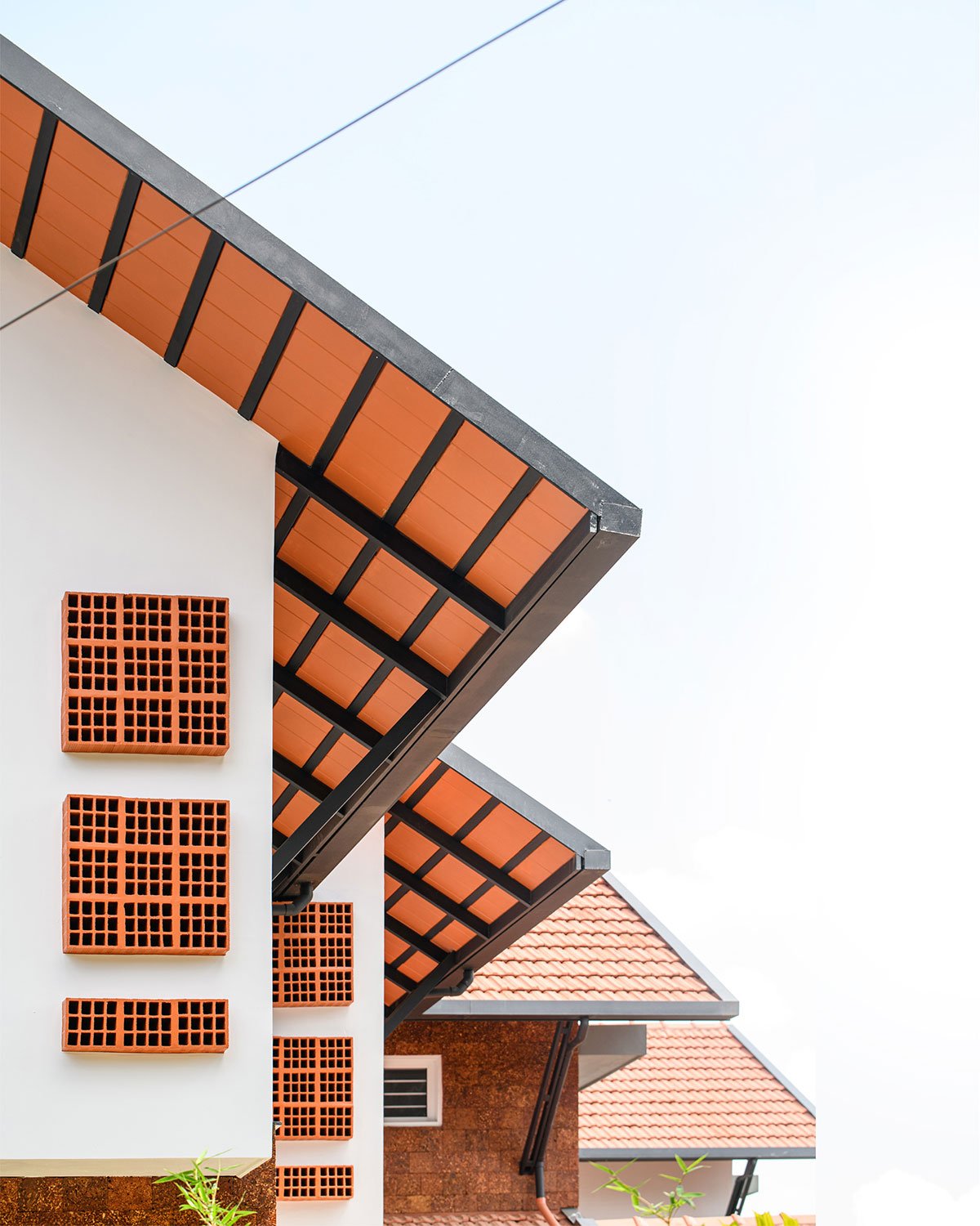 Key architectural elements include perforated walls, which not only enhance the visual interest of the structure but also facilitate ventilation and the play of light and shadow, contributing to a tranquil and balanced atmosphere. Large openings throughout the home maximize views of the surrounding landscape, creating an expansive and interconnected living experience. These openings are strategically placed to frame picturesque scenes of the greenery outside, allowing the natural beauty to become an integral part of the interior decor.