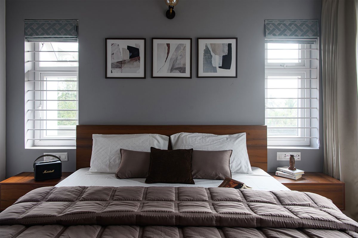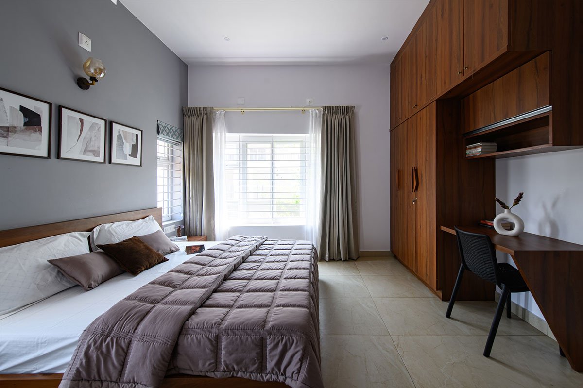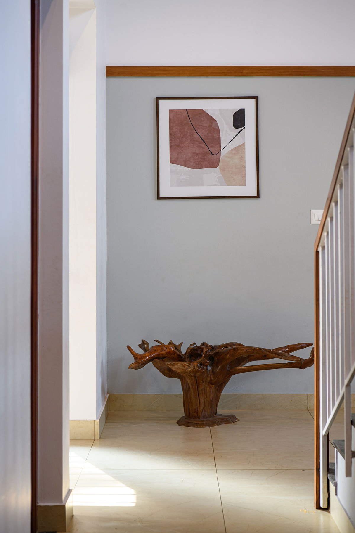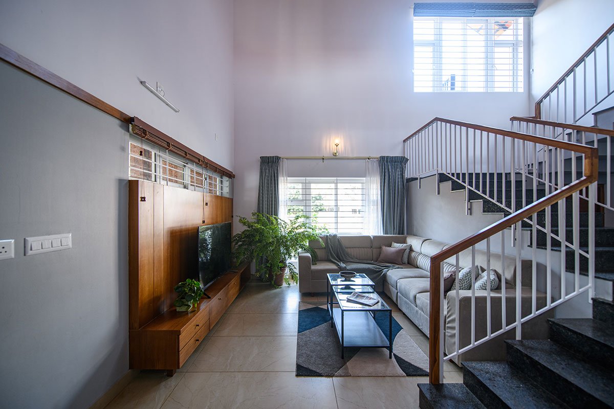 Key architectural elements include perforated walls, which not only enhance the visual interest of the structure but also facilitate ventilation and the play of light and shadow, contributing to a tranquil and balanced atmosphere. Large openings throughout the home maximize views of the surrounding landscape, creating an expansive and interconnected living experience. These openings are strategically placed to frame picturesque scenes of the greenery outside, allowing the natural beauty to become an integral part of the interior decor.