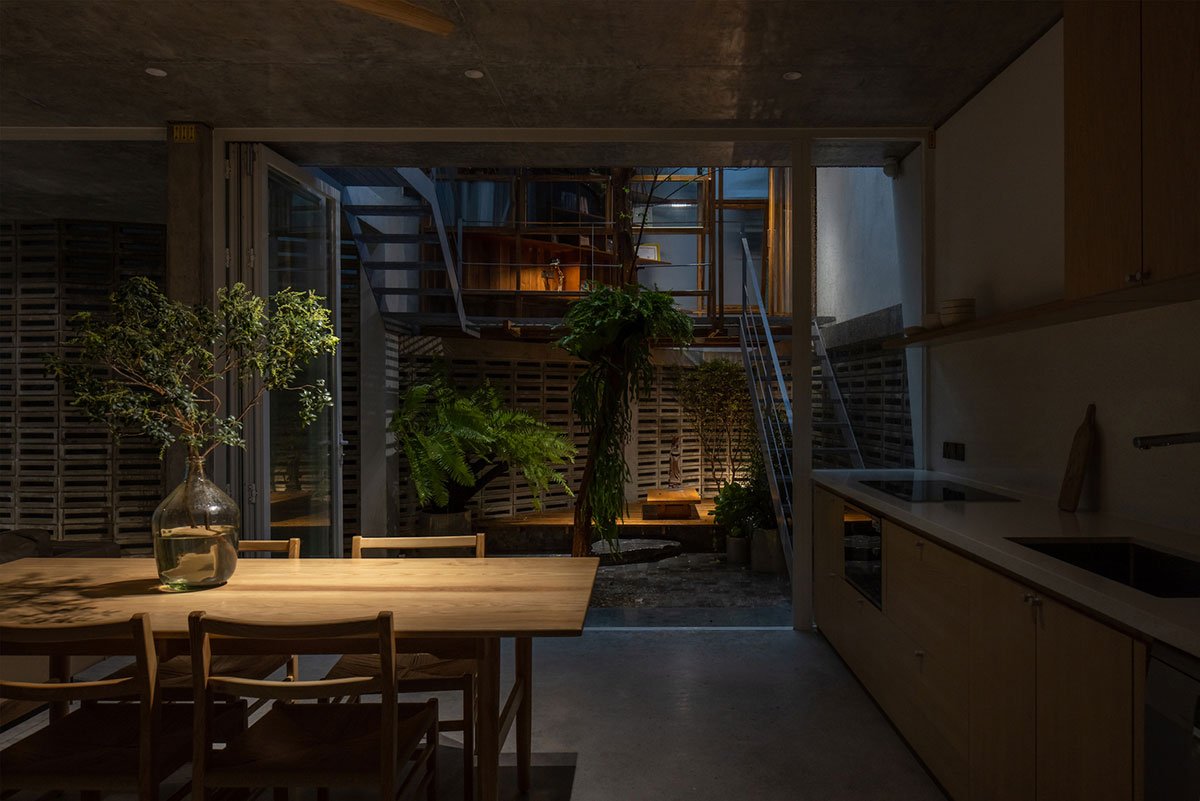 [Text as submitted by architect] Kho Rèn house is a project created to serve the living needs of a young family of 5 members, spanning 2 generations. The house is built on an existing plot of land, located near the An Cựu River in Huế city, where the surrounding construction density is quite high. This plot has an area of 100 square meters and an irregular shape, with zigzag lines forming a unique and challenging design. The frontage of the plot faces west, which brings some significant disadvantages, especially with the tropical climate conditions of Central Vietnam.