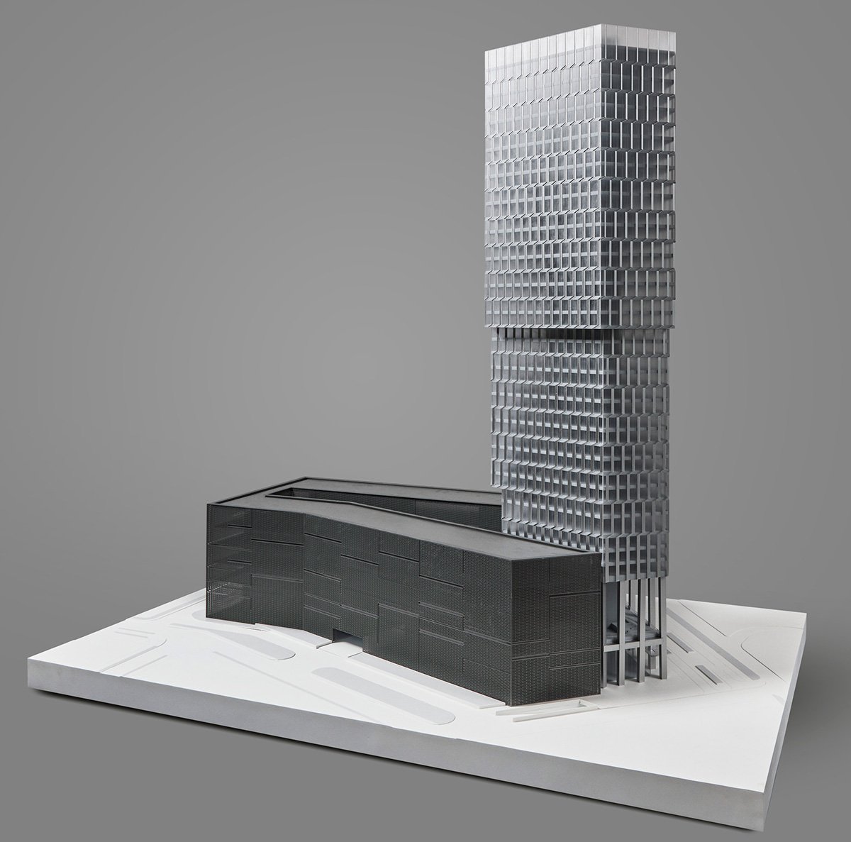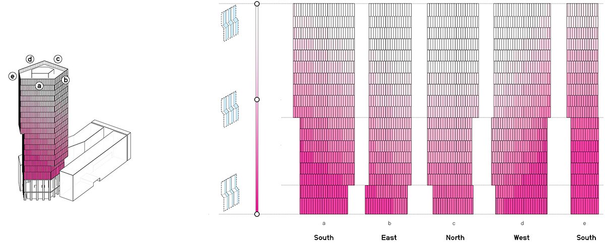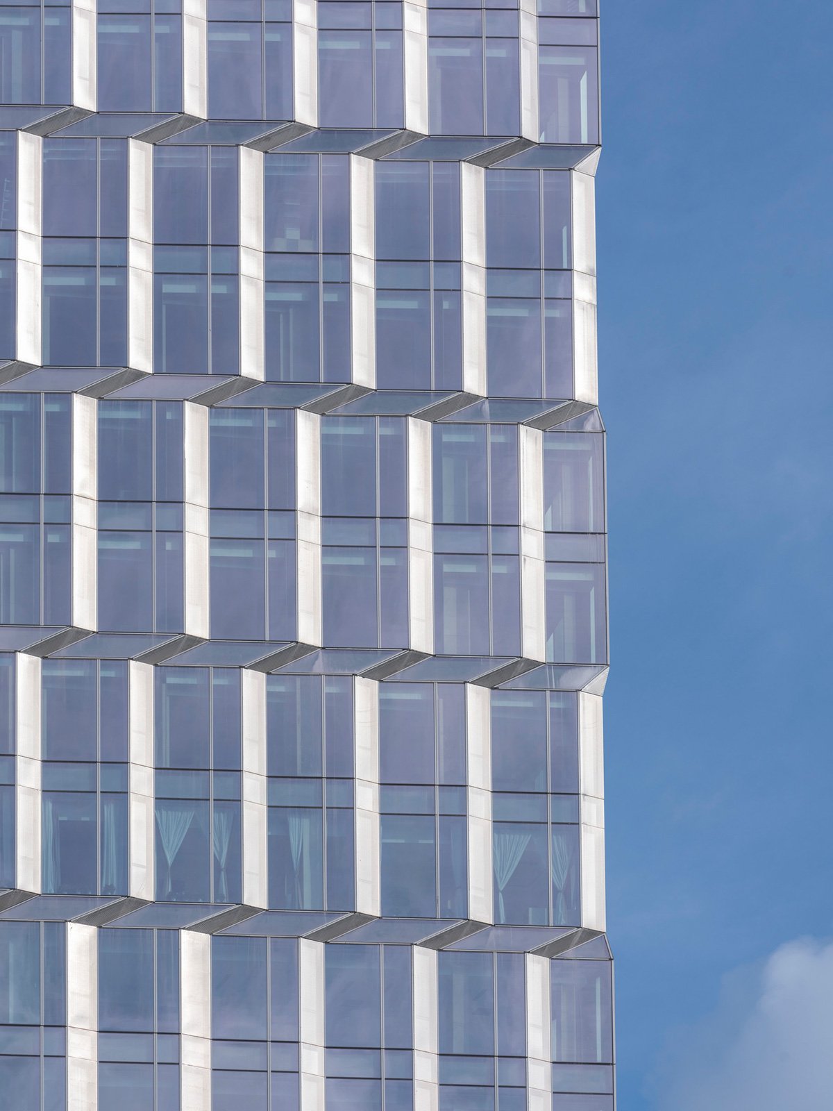 The façade of the Cloud Tower gives the impression of a folded envelope, which is composed of stainless-steel panels slightly shifted against each other. Inspired by the lightness and transformability of clouds in the sky, the relief-like façade elements create a lively interplay of light and shadow that changes depending on the time of day and weather.