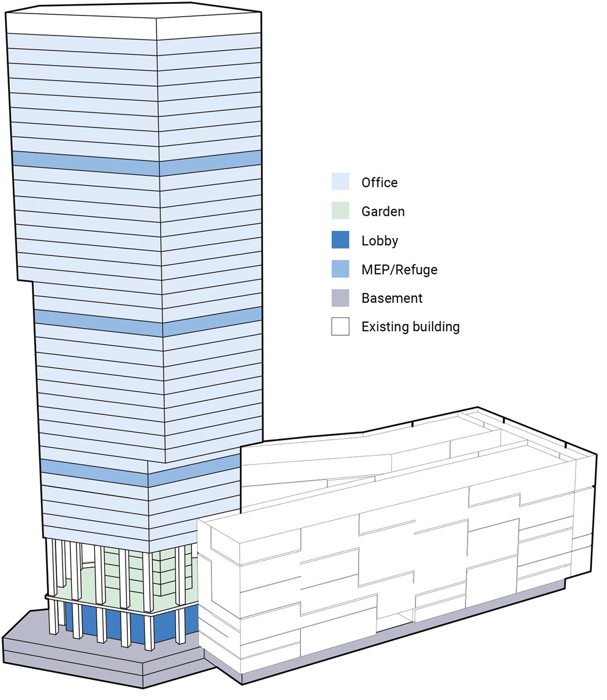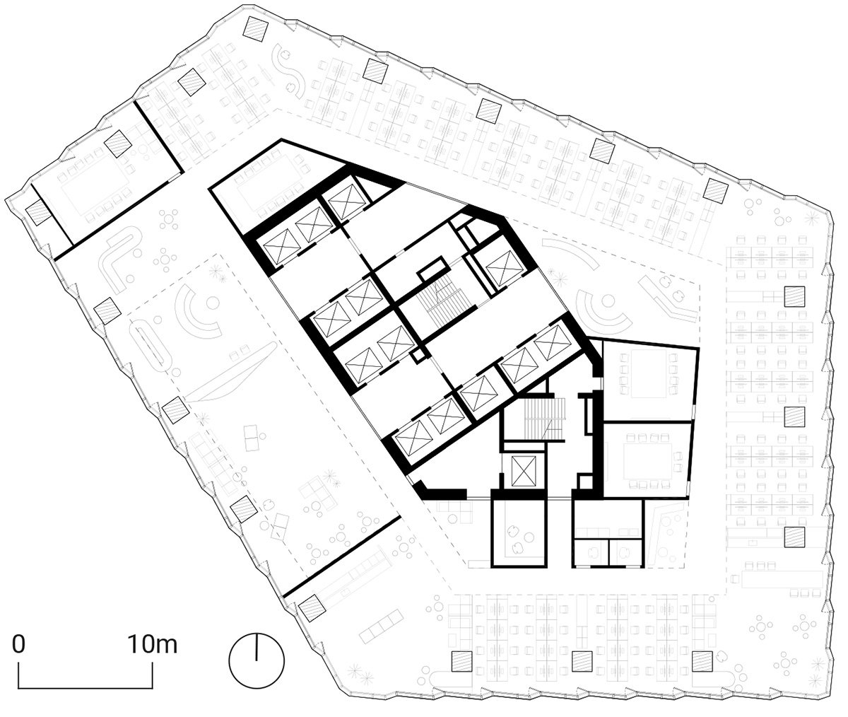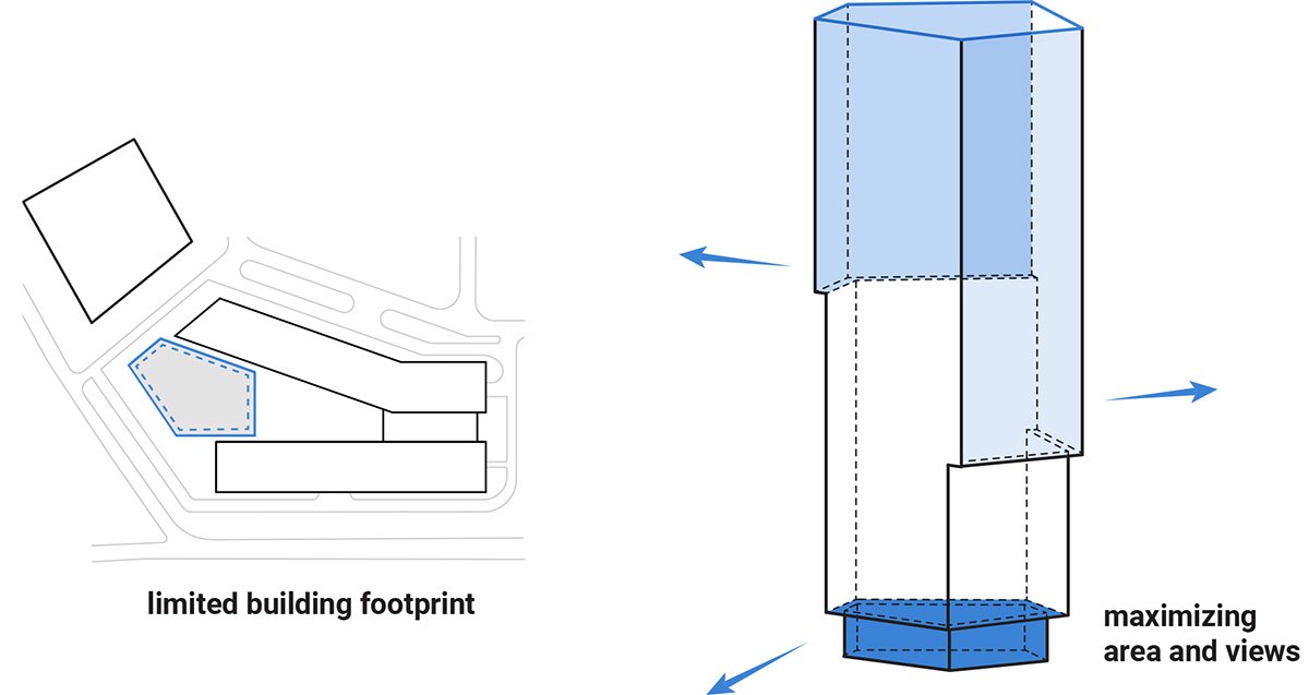 The tower base is nestled between two existing office wings, on the narrow space that is still free on the site. The pentagonal footprint of the new high-rise is the result of maximizing the given space on site. The relatively small floor area of the open base floors is extended in the upper office floors as the tower rises above the existing buildings towards the sky.