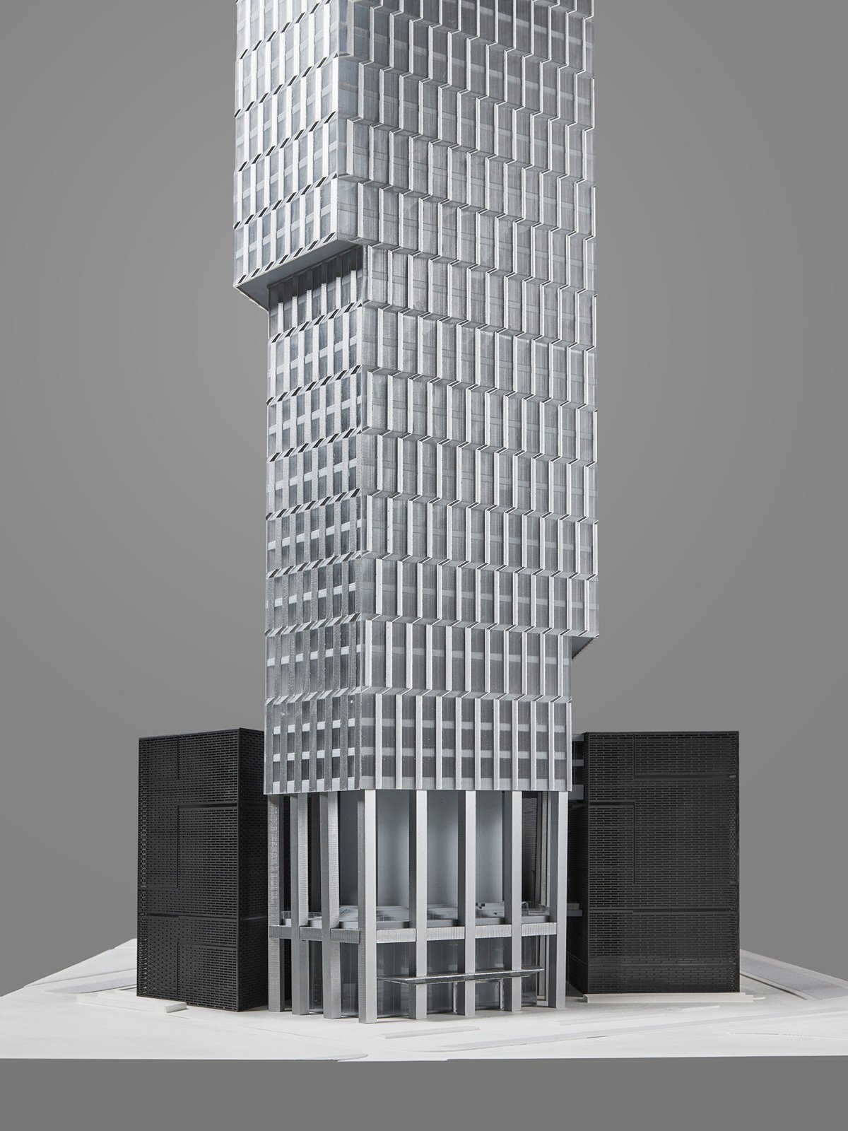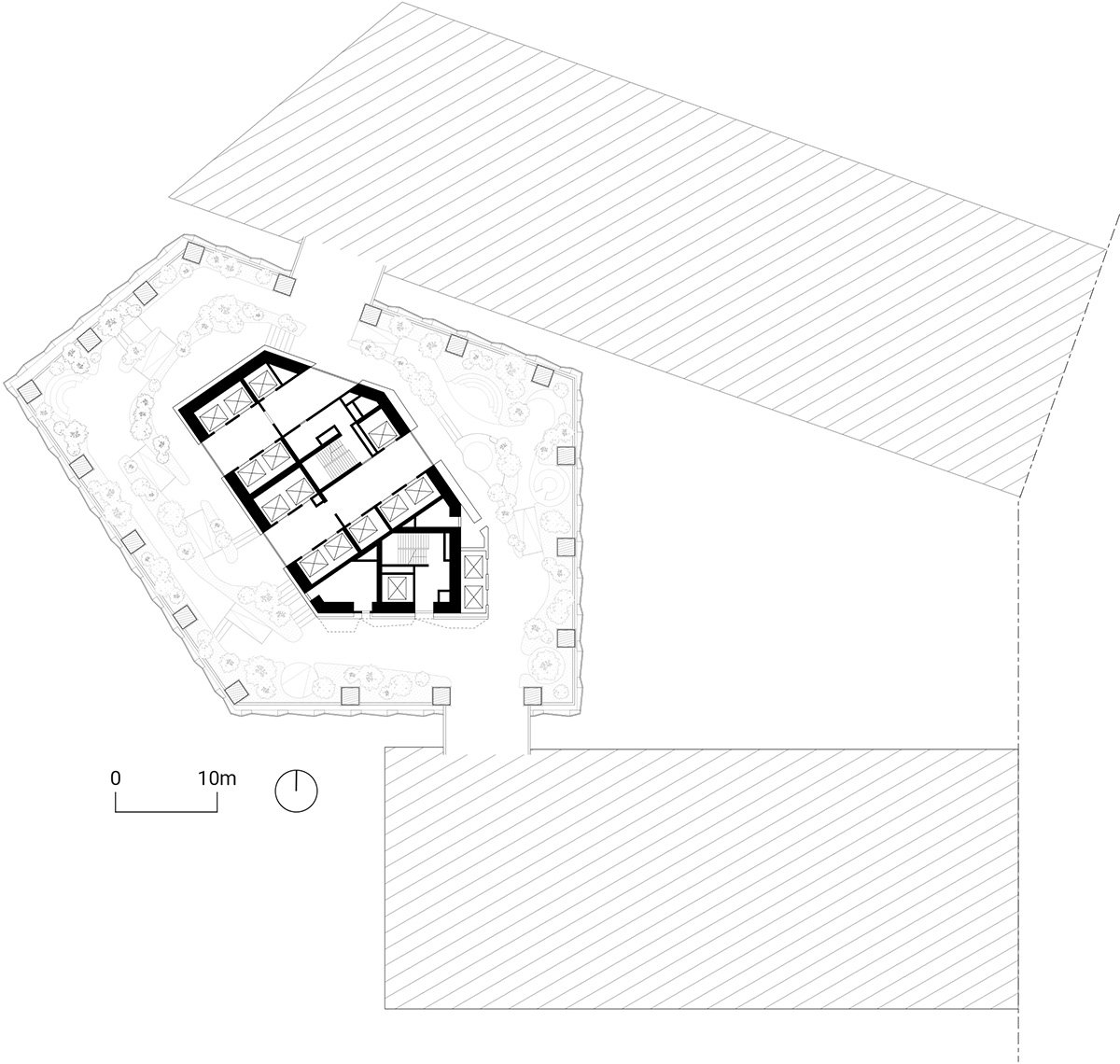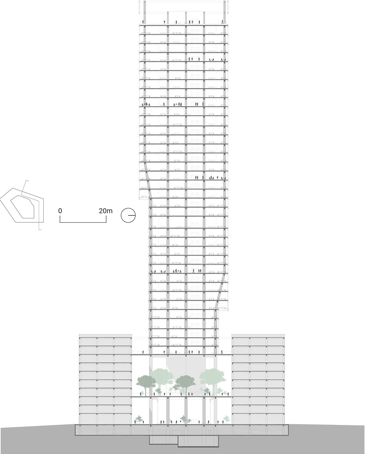 The tower base is nestled between two existing office wings, on the narrow space that is still free on the site. The pentagonal footprint of the new high-rise is the result of maximizing the given space on site. The relatively small floor area of the open base floors is extended in the upper office floors as the tower rises above the existing buildings towards the sky.