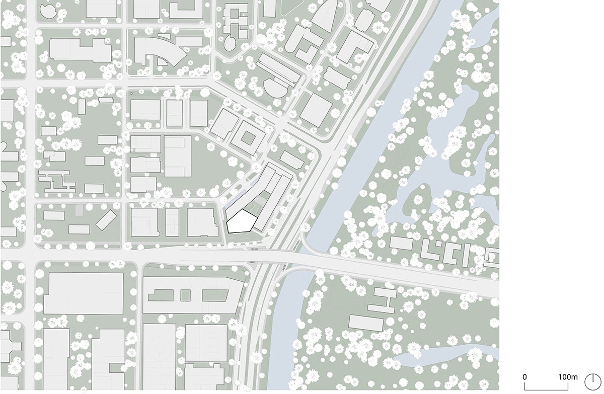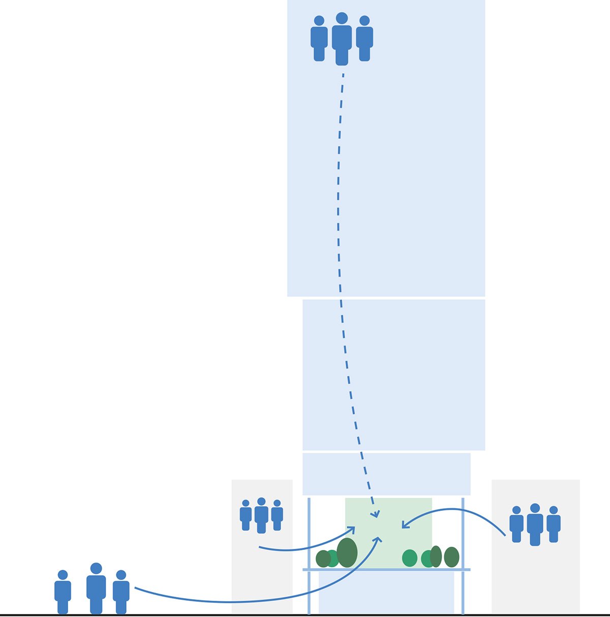 Towards the outside, the base floors are kept open in order to create a publicly accessible lobby, which serves as an urban living room, and an elevated garden above, where events and art exhibitions can be held. The garden functions as a connecting platform for the existing buildings and houses leisure spaces, sports facilities, and cafés—also benefitting the wider public in the area. The open base allows for daylight and air in the courtyard and the lower office buildings.