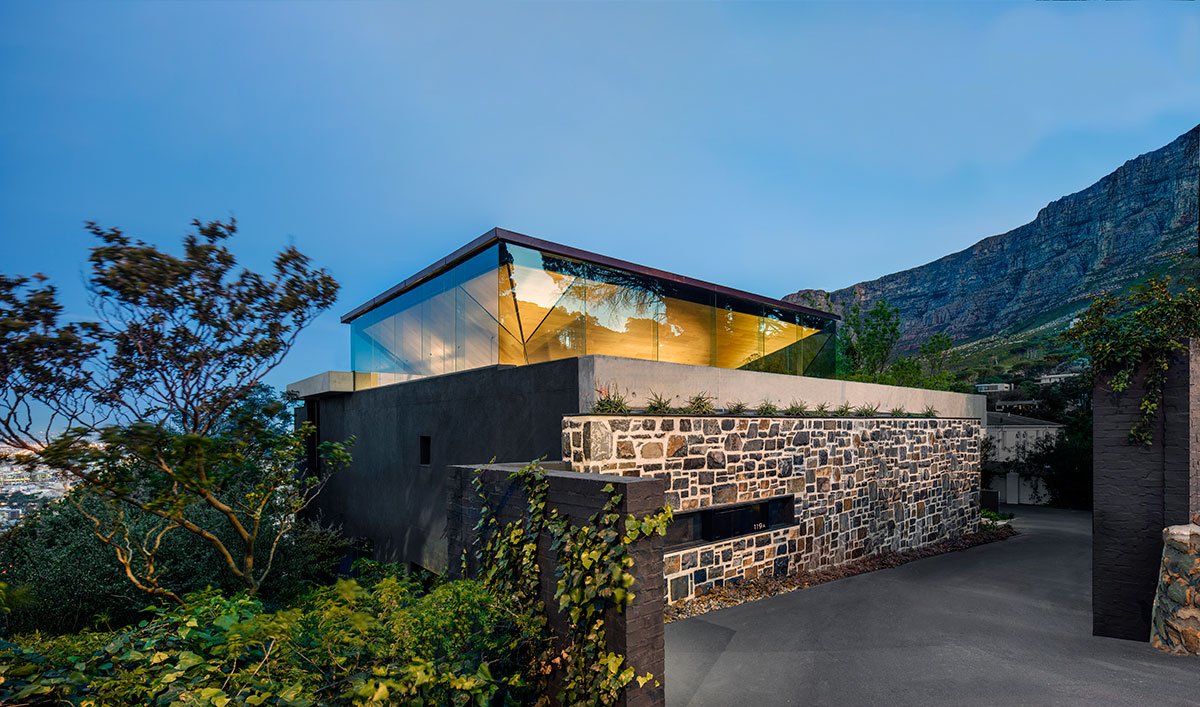 The house presents a stone wall, built in a traditional Cape way, to the busy city street that it sits on, revealing very little about its interior. At night, the inverted pyramid roof glows creating a giant lightbox adding to the intrigue.